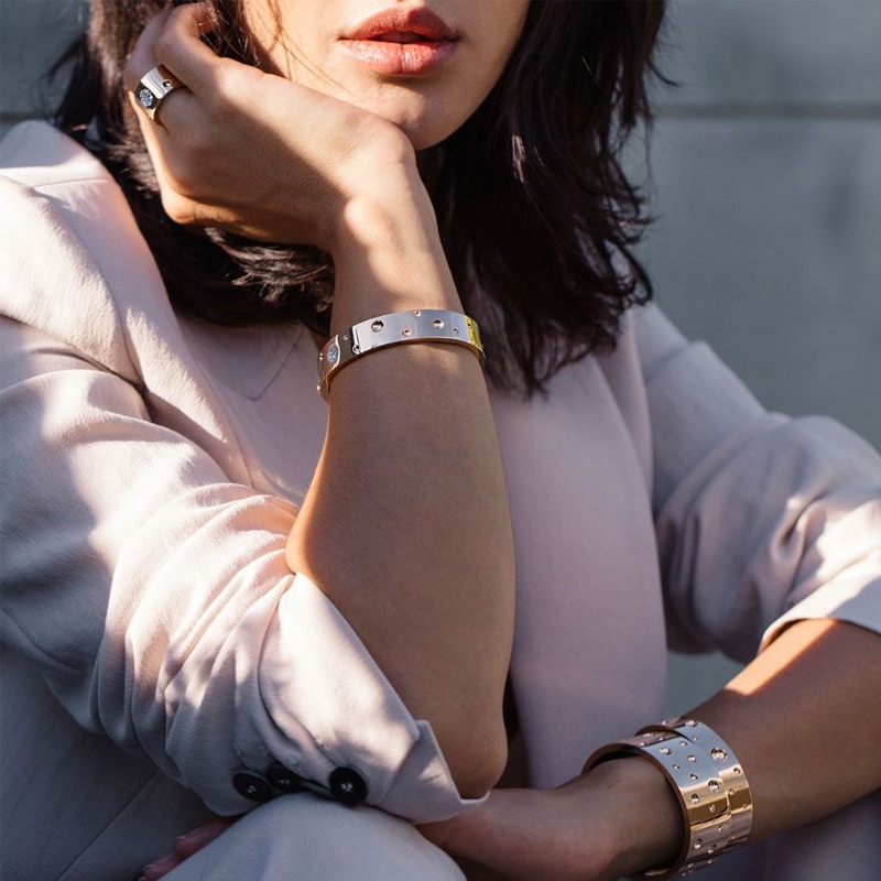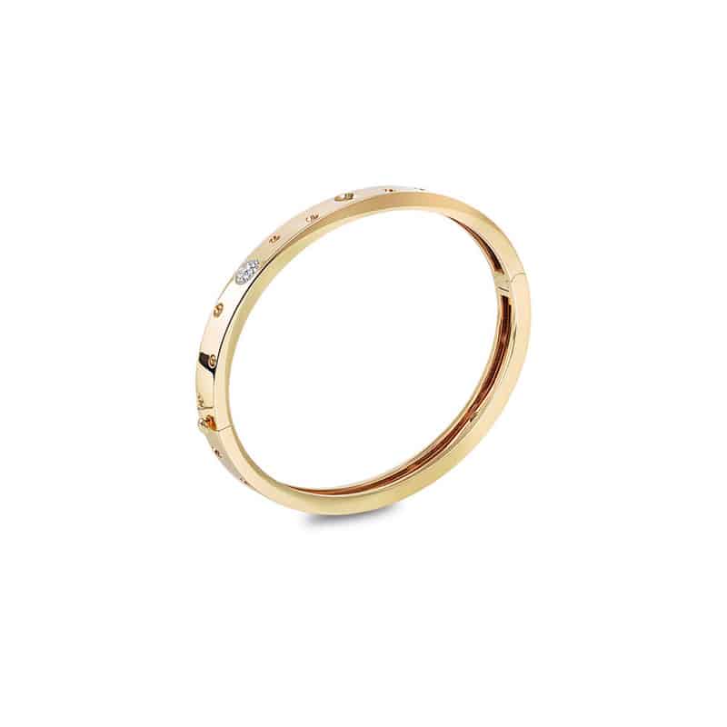 Roberto Coin Pois Moi Luna bracelet. In each piece of the Pois Moi Luna collection, we can appreciate how the gold craters and carefully mapped spatial trajectories recreate the uneven surface characteristic of the moon. A truly galactic look! A 0.018 carat ruby and 19 V GS diamonds of 0.10 carats. Material : Yellow gold Gem : Diamond Being a handcrafted product, the above characteristics may be subject to slight variations.
