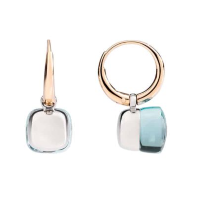 Pomellato Nudo earrings, available in all types of jewelry, has been growing since 2001 and has become a true icon of modern style. Within the collection there are variants that adapt perfectly to the woman who wears them. Earrings created in rose gold and white gold, characterized by a “naked” stone, in this case blue quartz. Elegance and sophistication are evident in the character of these earrings.