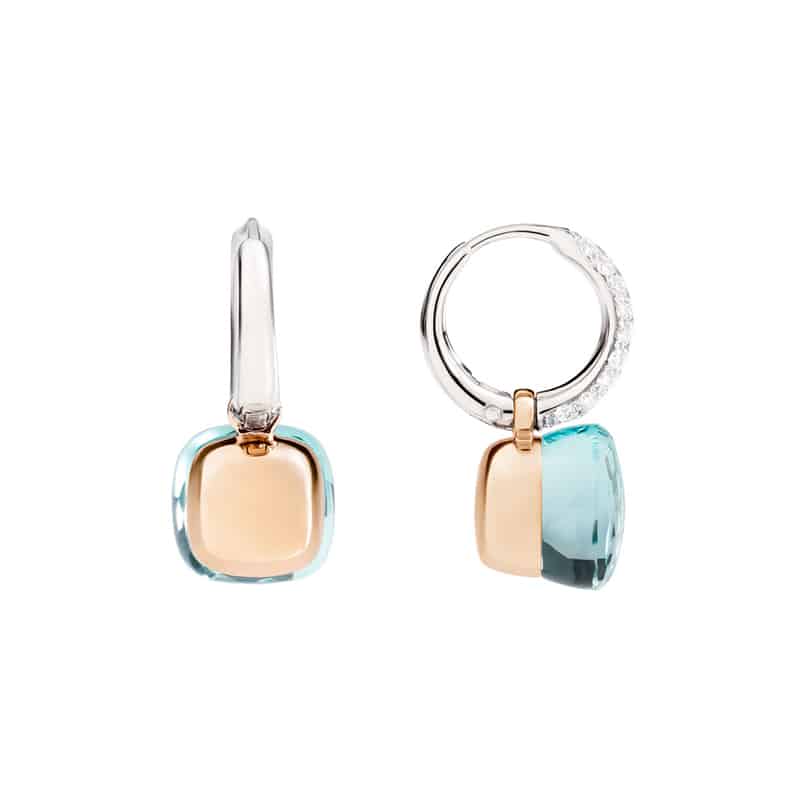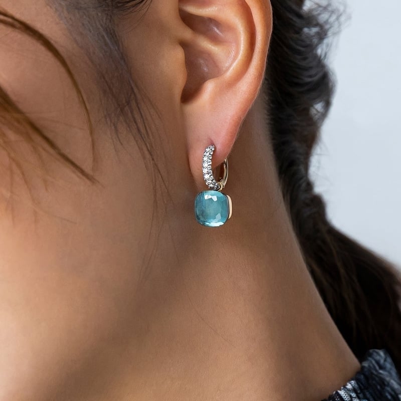 Pomellato earrings from the Nudo collection, available in all types of jewelry, has been growing since 2001 and has become a true icon of modern style. Within the collection there are variants that perfectly adapt to the woman who wears them. Earrings created in rose gold and white gold, characterized by a “naked” stone in this case Blue Topaz. This design is complemented by the diamond studded setting that gives it a different and particular touch. Elegance and sophistication are evident in the character of these earrings.