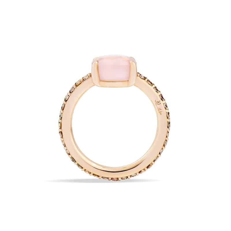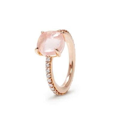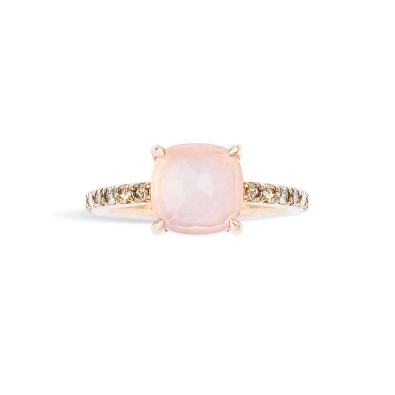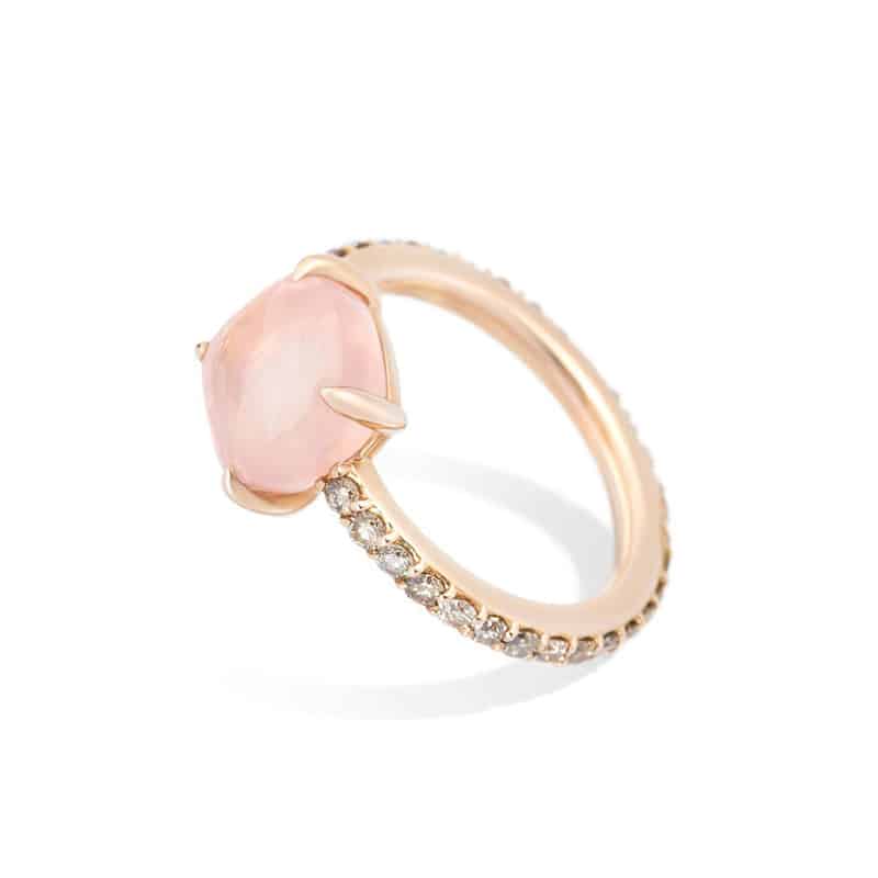 This elegant ring is part of Pomellato’s Baby collection. It is set in a way that evokes a dusty and refined aura. The ring is crafted in 18-karat rose gold that amazingly reflects tanks of light. The polished surface is decorated with round white diamonds. The glimpse of the composition is a rose quartz stone on the top. The brand logo is engraved on the inside of the rim. Whether worn alone or in different color combinations, this delicate piece of jewelry combines light, texture and color in a single motif that brings an elegant look to every outfit.