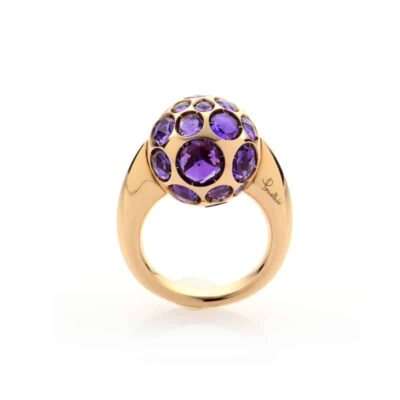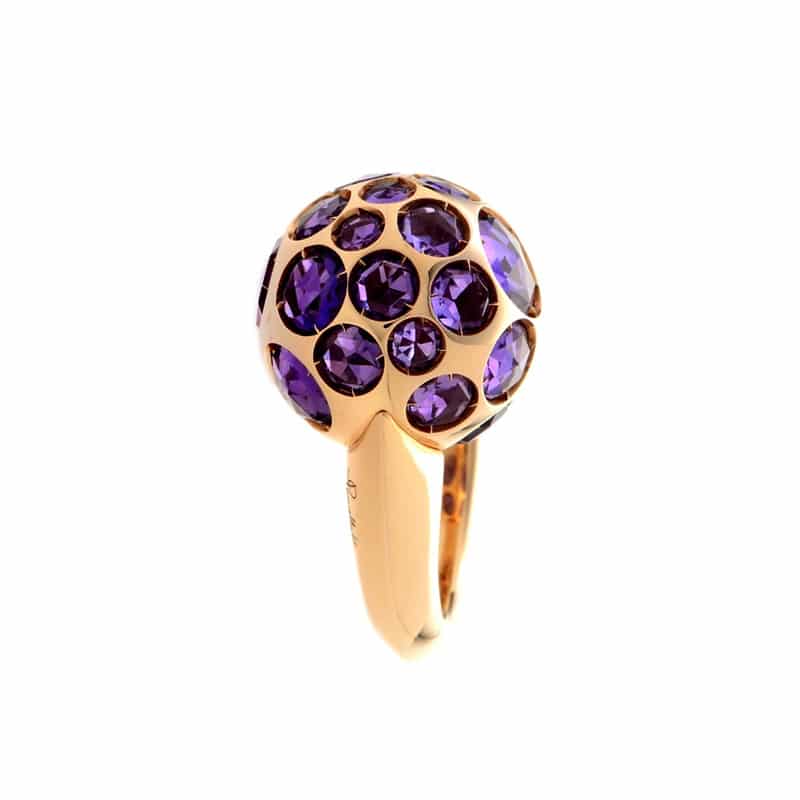 This exotic ring from Pomellato is modern and fun. It is made of rose gold and features multiple amethysts of different sizes.