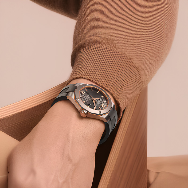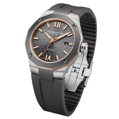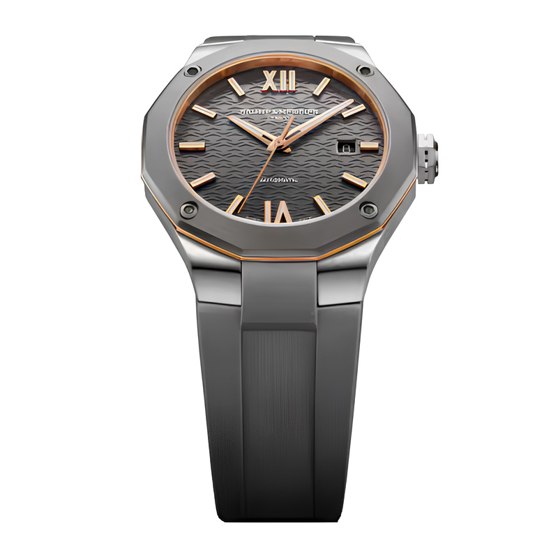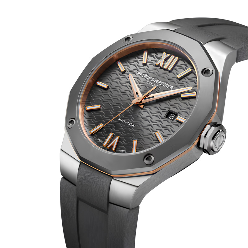 The Baume & Mercier Riviera M0A10660 watch features a sleek design, showcasing a slate-gray dial. It features a gray rubber strap that ensures comfort and durability. It has a polished and satin-finished stainless steel case with a diameter of 42mm. It incorporates an automatic movement, which provides a power reserve of approximately 38 hours. It is an elegant watch with balanced proportions that give the piece a timeless appeal.