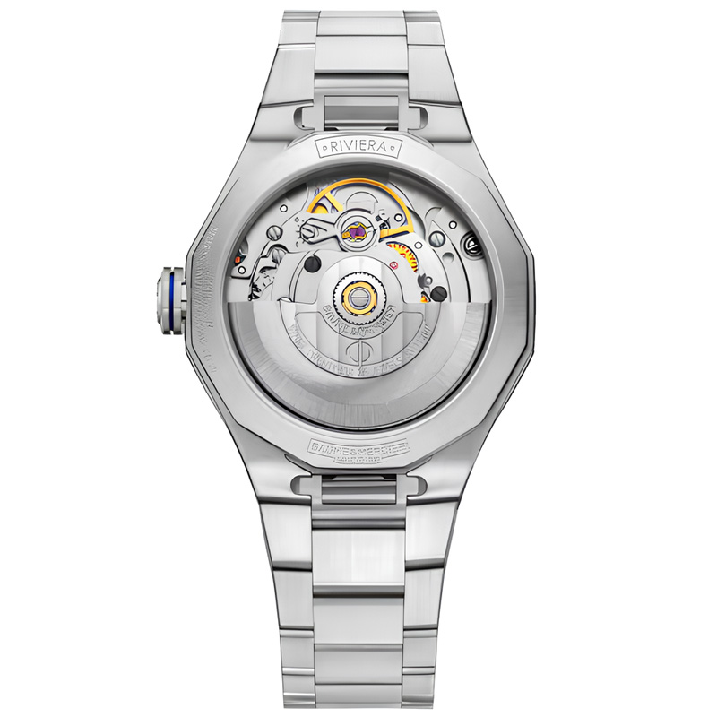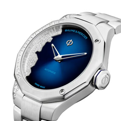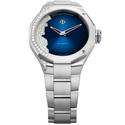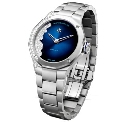 The Baume & Mercier Riviera M0A10677 watch has an elegant design, displaying a blue night degraded lacquered dial with “soleil” satin finish. It features a stainless steel bracelet that ensures comfort and durability. It has a stainless steel case with polished and satin finish with a diameter of 33mm. It incorporates an automatic movement, which provides a power reserve of approximately 38 hours. It is an elegant watch with balanced proportions that give the piece a timeless appeal.