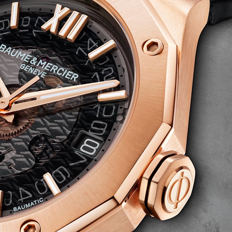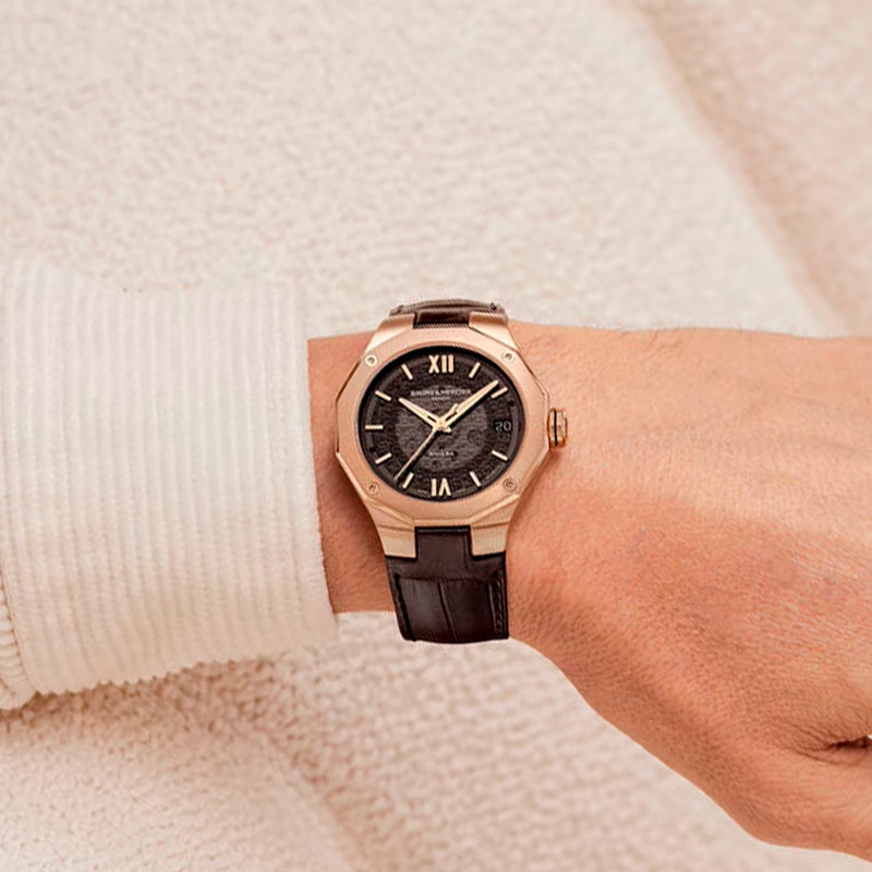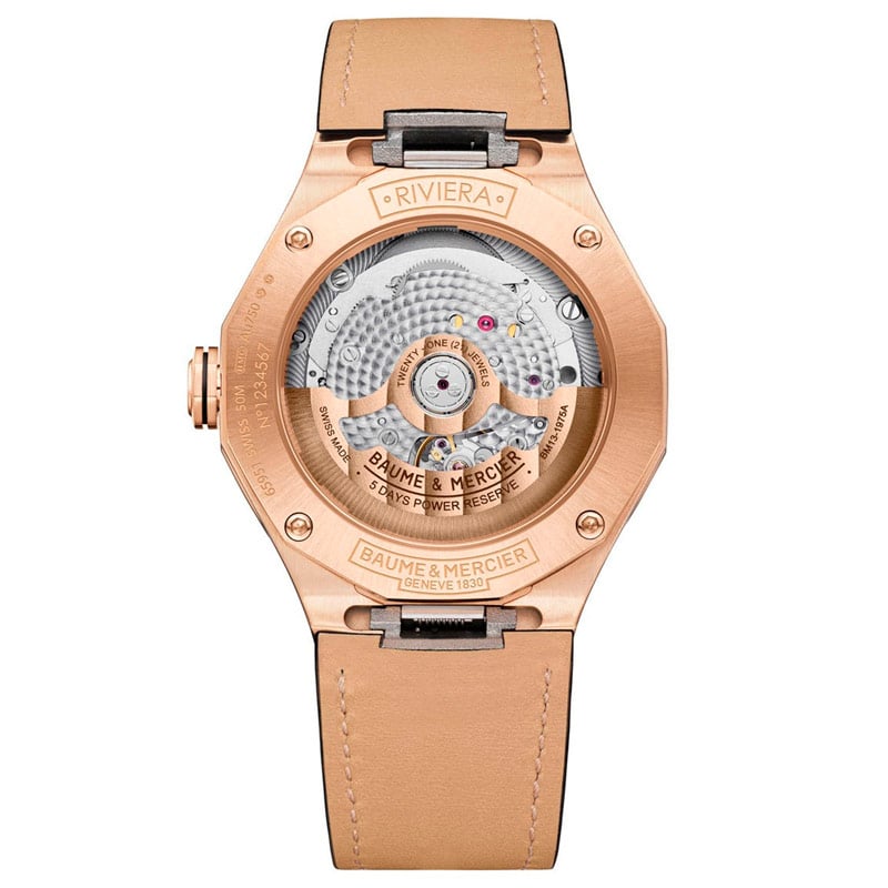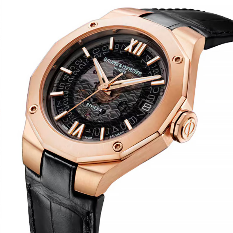 The Baume & Mercier Riviera M0A10787 watch features a sleek design, showcasing a black dial. It features a black alligator leather strap that ensures comfort and durability. It has an 18K rose gold case with a polished and satin-brushed finish with a diameter of 39mm. It incorporates a Manufacture Baumatic automatic movement, which provides a power reserve of approximately 120 hours. It is an elegant timepiece with balanced proportions that give the piece a timeless appeal.