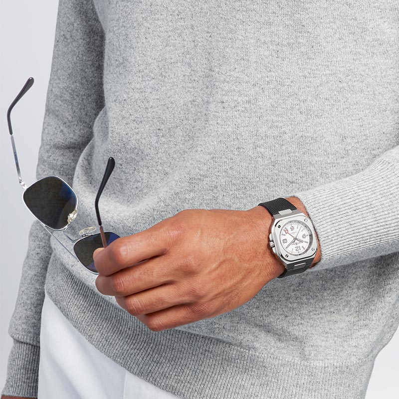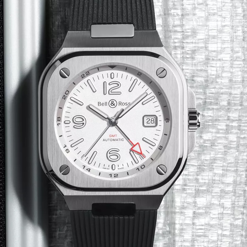 Bell & Ross BR 05 GMT WHITE watch. This watch has two strong features: a GMT complication and an opaline white dial. It is not only practical because of its dual time zone display, but also attractive because of its great distinction.