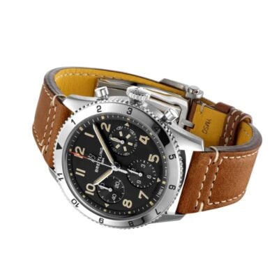 The Breitling Classic Avi Chronograph 42 P-51 Mustang A233803A1B1X1 watch features an elegant design, showcasing a black dial with three subdials. The reference A233803A1B1X1 incorporates a brown calfskin strap that ensures comfort and durability. It has a stainless steel case with a diameter of 42mm. The combination of legibility, comfort and discreet style make this Classic Avi the perfect aviator watch to accompany you on any occasion.