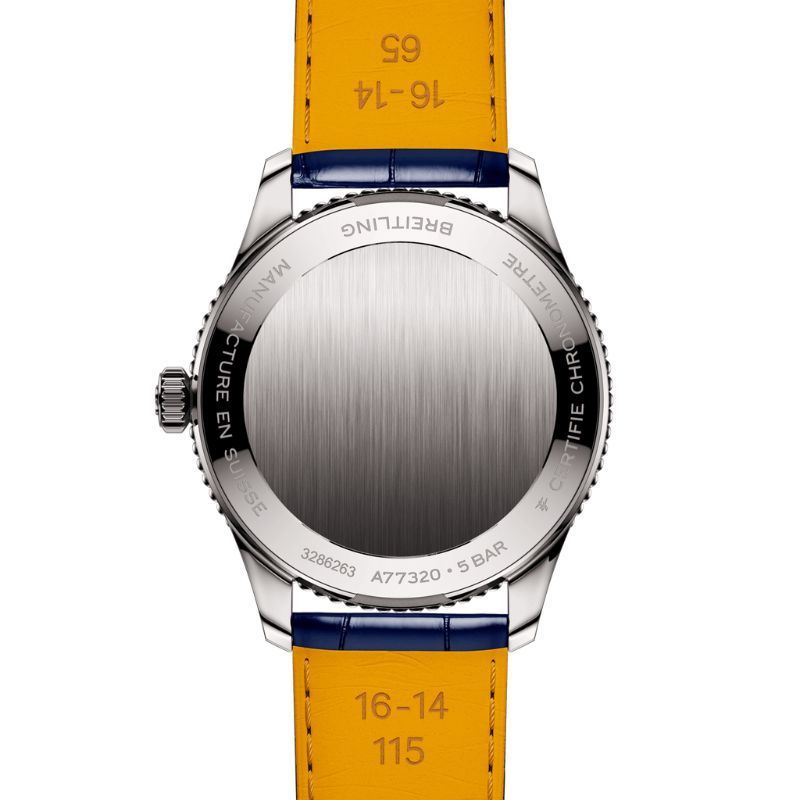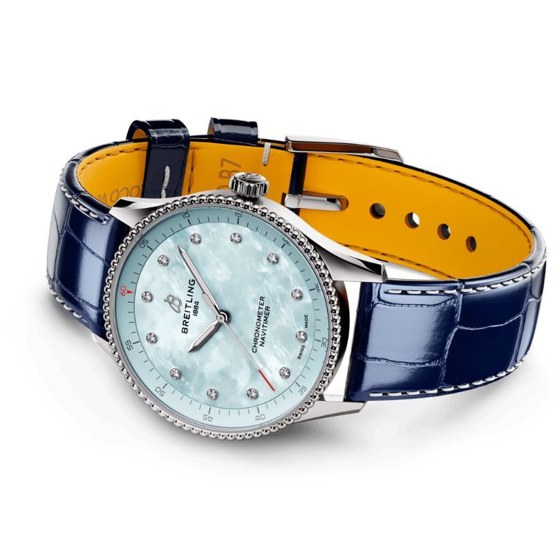 The Breitling Navitimer 32 A77320171C1P1 watch has an elegant design, which displays a blue mother-of-pearl dial. It features a blue alligator leather strap that ensures comfort and durability. It has a stainless steel case with a diameter of 32mm. It incorporates a thermo-compensated SuperQuartz™ movement with caliber Breitling 77. The combination of comfort and functionality along with a style that fuses classic and contemporary make this Navitimer the perfect versatile timepiece to accompany you on any occasion.