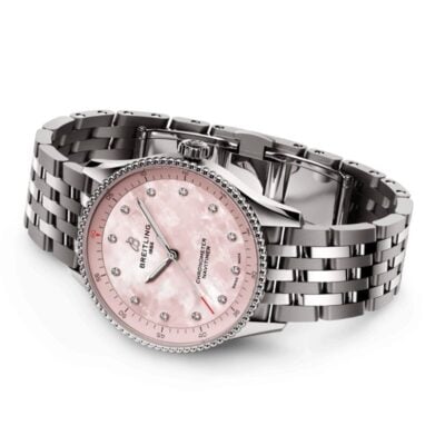 The Breitling Navitimer 32 A77320D91K1A1 watch has an elegant design, which displays a pink mother-of-pearl dial. It features a stainless steel bracelet that ensures comfort and durability. It has a stainless steel case with a diameter of 32mm. It incorporates a SuperQuartz™ thermocompensated movement with Breitling caliber 77. The combination of comfort and functionality along with a style that fuses classic and contemporary make this Navitimer the perfect versatile timepiece to accompany you on any occasion.