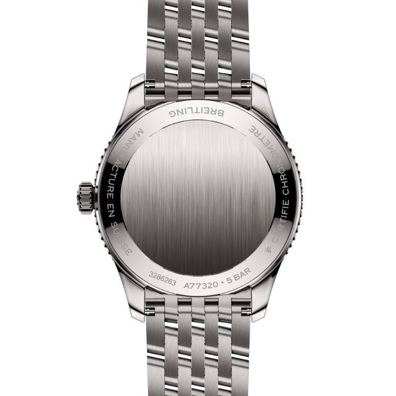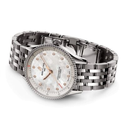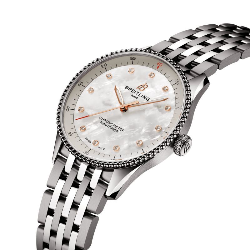 The Breitling Navitimer 32 A77320E61A2A1 watch has an elegant design, which displays a mother-of-pearl dial. It features a stainless steel bracelet that ensures comfort and durability. It has a stainless steel case with a diameter of 32mm. It incorporates a thermocompensated SuperQuartz™ movement with Caliber Breitling 77. The combination of comfort and functionality along with a style that fuses classic and contemporary make this Navitimer the perfect versatile watch to accompany you on any occasion.