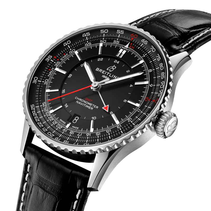 The Breitling Navitimer Automatic GMT 41 A32310251B1P1 watch features an elegant design, showcasing a black dial. Reference A32310251B1P1 incorporates a black alligator leather strap that ensures comfort and durability. The combination of comfort and functionality along with a style that fuses classic and contemporary makes this Navitimer the perfect versatile timepiece to accompany you on any occasion.