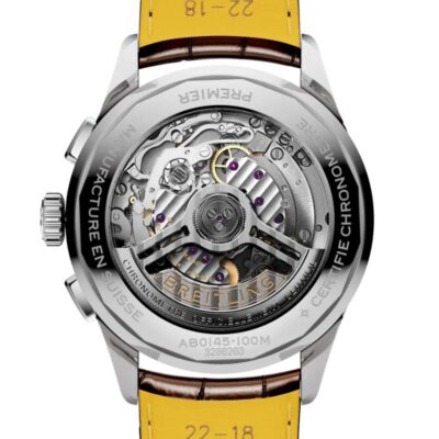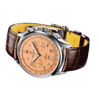 The Breitling Premier B01 Chronograph 42 AB0145331K1P1 watch has an elegant design, which displays a copper dial with two subdials. It features a brown alligator leather strap that ensures comfort and durability. It has a stainless steel case with a diameter of 42mm. It incorporates a self-winding mechanical movement with caliber Breitling 01 (Manufacture), which provides a power reserve of 70 hours. As a symbol of everyday elegance, the Premier watch stands out for its quality, performance and essence.