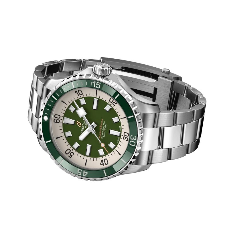 The Breitling Superocean Automatic 44 A17376A31L1A1 watch has an elegant design, displaying a green and white dial. It features a stainless steel bracelet that ensures comfort and durability. It has a stainless steel case with a diameter of 44mm. It incorporates an automatic mechanical movement with caliber Breitling 17, which provides a power reserve of approximately 38 hours. The combination of comfort and functionality along with a style that fuses the classic with the contemporary make this Superocean Automatic the perfect versatile watch to accompany you on any occasion.