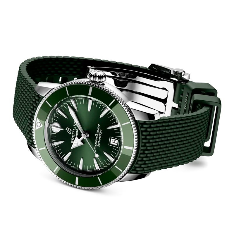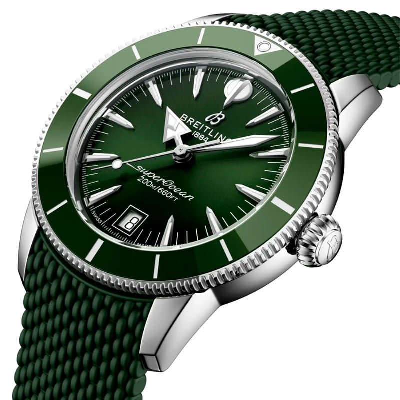 The watch Breitling Superocean Heritage Automatic 40 AB3110361L1S1 features a sleek design, showcasing a green dial. Rubber strap. It has a stainless steel case with a diameter of 40mm. It incorporates a high-frequency automatic movement with Breitling B31 caliber (Manufacture), which provides a power reserve of approximately 78 hours. The combination of comfort and functionality along with a style that fuses the classic with the contemporary make this Superocean Heritage the perfect versatile watch to accompany you on any occasion.