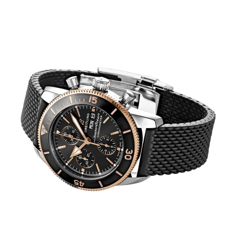 The Breitling Superocean Heritage Chronograph 44 U13313121B1S1 watch has an elegant design, which displays a black dial with three subdials. It features a black rubber strap that ensures comfort and durability. It has a stainless steel and 18k red gold case with a diameter of 44mm. It incorporates a self-winding mechanical movement with caliber Breitling 13, which provides a power reserve of 48 hours. The combination of comfort and functionality along with a style that fuses classic and contemporary make this Superocean Heritage the perfect versatile watch to accompany you on any occasion.