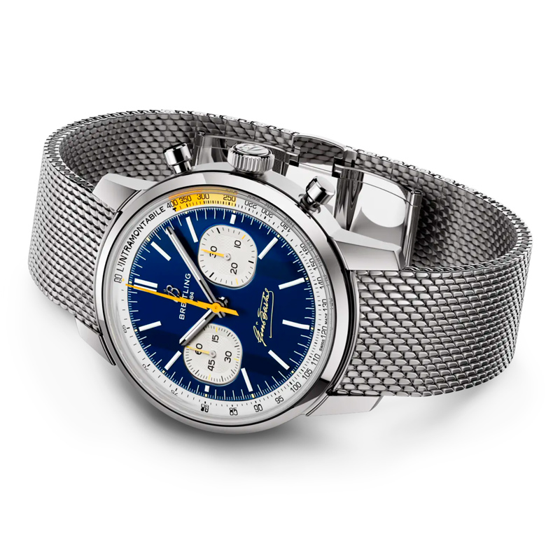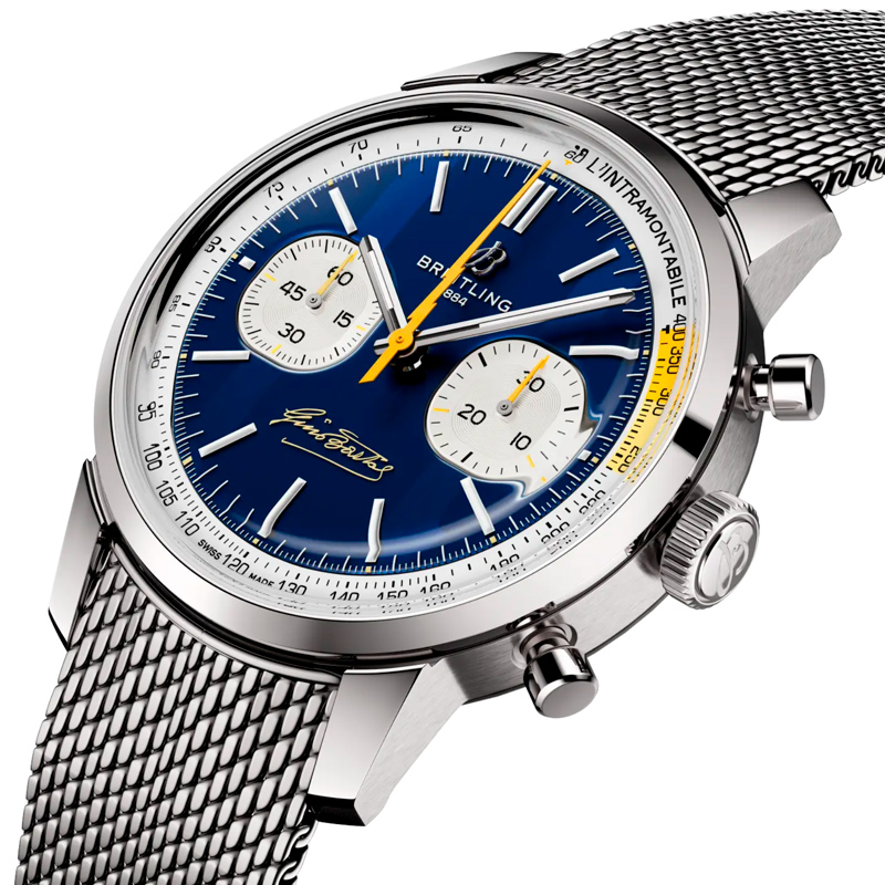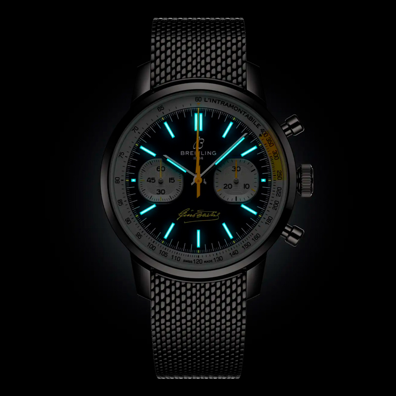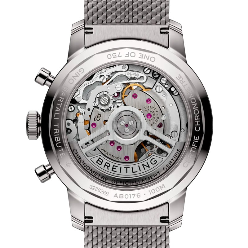 The Breitling Top Time B01 Gino Bartali AB01767A1C1A1 features a 41mm stainless steel case housing the in-house Breitling 01 movement, offering a 70-hour power reserve and chronograph function. Water-resistant to 100m and with a fixed bezel, this cycling-inspired timepiece combines its retro racing aesthetic with a stainless steel bracelet. The exhibition case back reveals the precision movement, creating a robust and elegant tribute watch weighing 141.8g.