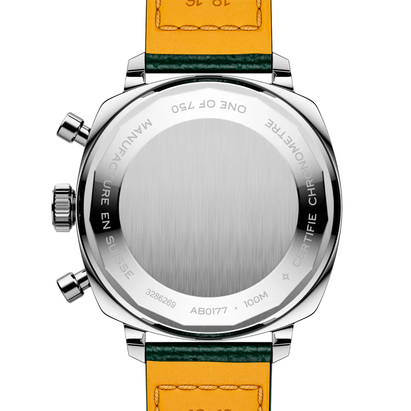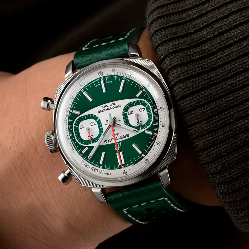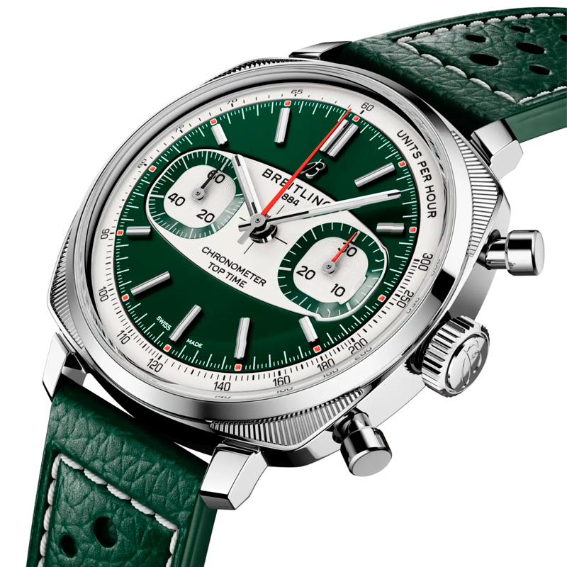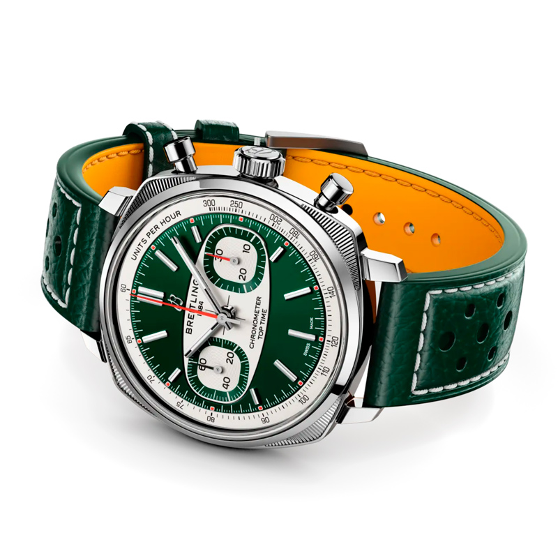 The watch Breitling Top Time B01 Racing AB01771A1L1X1 channels adrenaline with retro design and cutting-edge performance. It features a 38mm diameter stainless steel case and screw-down caseback. The sapphire crystal is arched and features anti-reflective treatment on both sides. Fixed bevel Non-screwed crown with double gasket. White dial with distinctive Martini Racing green and red stripes. Matching calfskin strap, also in green. Automatic mechanical movement with Breitling Caliber 01 (Manufacture), with an approximate power reserve of 70 hours. Water-resistant to 10 meters.