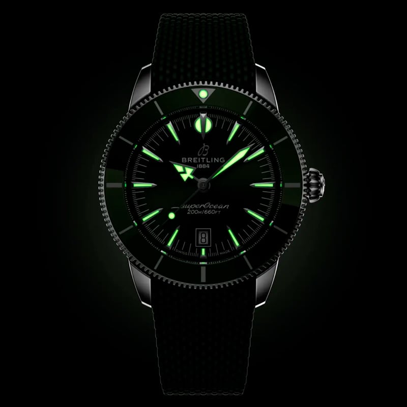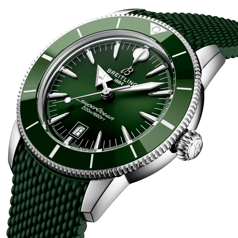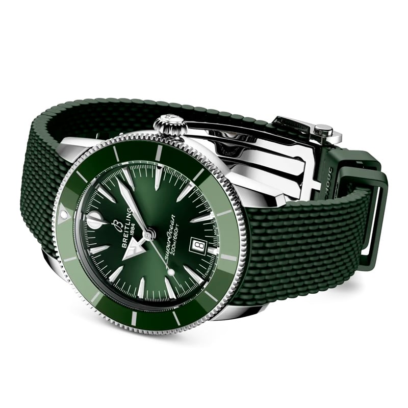 The watch Breitling Top Time B31 Automatic AB3112361L1S1 features a sleek design, showcasing a green dial. Rubber strap. It has a stainless steel case with a diameter of 44mm. It incorporates an automatic mechanical movement with Breitling B31 caliber (Manufacture), which provides a power reserve of approximately 78 hours. It is a watch from the Top Time collection that captures the momentum of the 60s, a decade marked by experimentation, fun, freedom and energy.