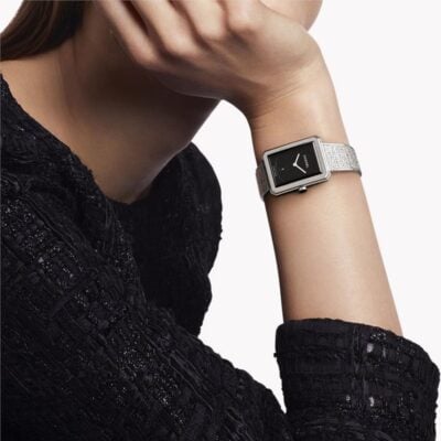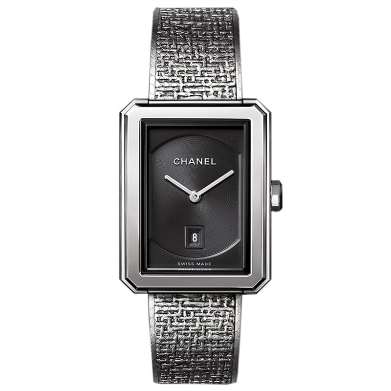 Chanel Tweed H4878 watch with quartz movement. Steel case 27.9 x 21.5 x 6.2 mm diameter and water-resistant to 30 m. Black dial and steel bracelet.