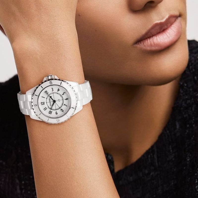 Chanel J12 H5698 watch. This piece of fine watchmaking incorporates a high precision quartz movement. It features a high resistance white ceramic and steel case with a diameter of 33 mm. It has a water resistance capacity of up to 200 m. In addition, its white lacquered dial and its white high resistance ceramic bracelet and steel triple folding clasp make this watch an elegant, resistant and timeless timepiece.