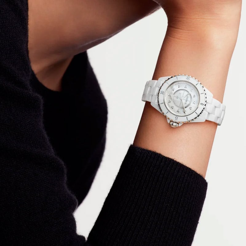 Chanel J12 H5704 watch. This piece of fine watchmaking incorporates a high precision quartz movement. It features a high resistance white ceramic and steel case with a diameter of 33 mm. It has a water resistance capacity of up to 200 meters. In addition, its white mother-of-pearl dial set with 12 diamond indexes of approximately 0.06 carats and its white high-strength ceramic bracelet and triple folding steel clasp make this watch an elegant, resistant and timeless piece.