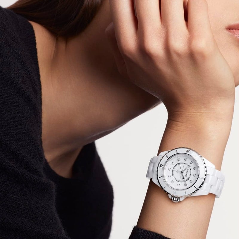 Chanel J12 watch in white ceramic with unidirectional rotating bezel in steel and ceramic bracelet. White lacquered dial set with 12 diamond indexes.