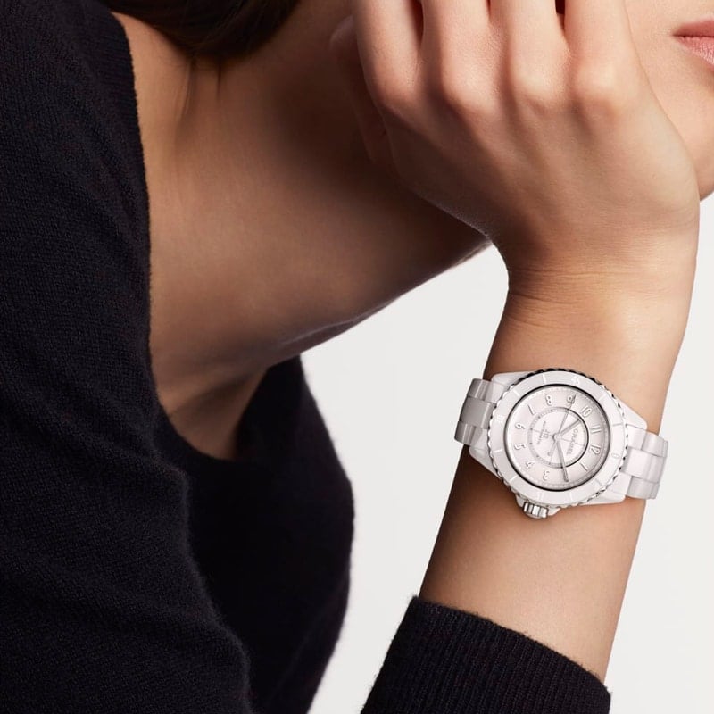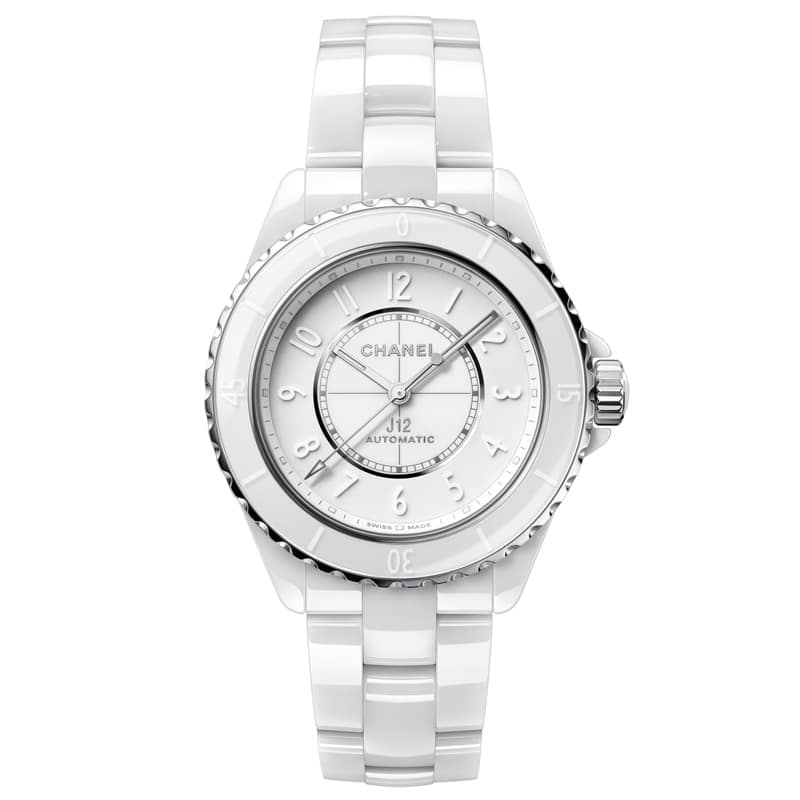 Chanel J12 Phantom watch with automatic movement. 38 mm diameter ceramic case, water-resistant to 200 m. White dial and ceramic bracelet.