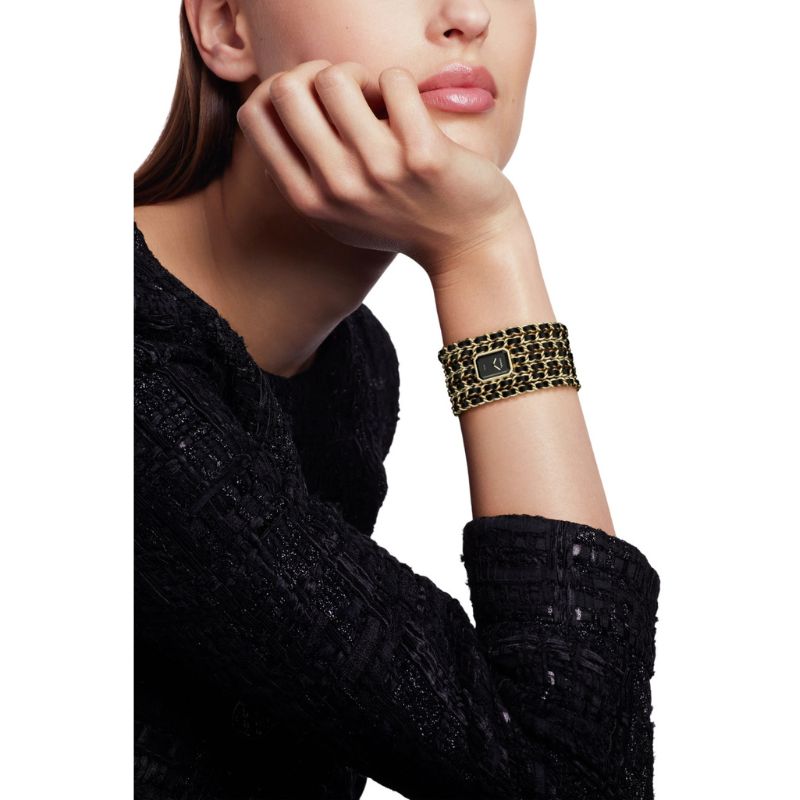 Chanel Première Cuff H9861 watch. This piece of fine watchmaking incorporates a high precision quartz movement. It features a steel case coated with 18K yellow gold of 19,7mm x 15,2mm. It has a water resistance capacity up to 30 meters. In addition, its black-lacquered dial and its steel chain bracelet coated with 18K yellow gold intervowen with black leather make this watch an elegant, resistant and timeless piece.