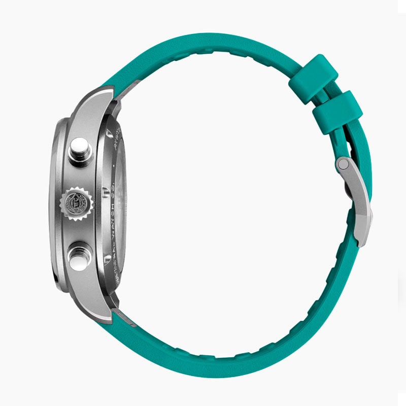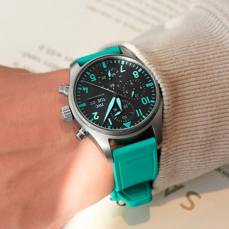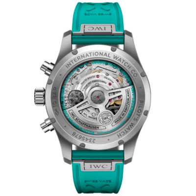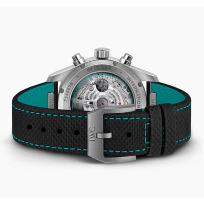 The IWC Pilot Chronograph 41 “Mercedes-AMG Petronas Formula One Team” Edition IW388108 watch stands out for its elegant design, which displays a black dial with three subdials. It incorporates a green rubber strap with EasX-CHANGE system that ensures a perfect fit on the wrist and offers excellent wearing comfort. With its combination of elegance and sporty spirit, this model is the first official team watch developed by IWC as part of its long-standing partnership with the team.