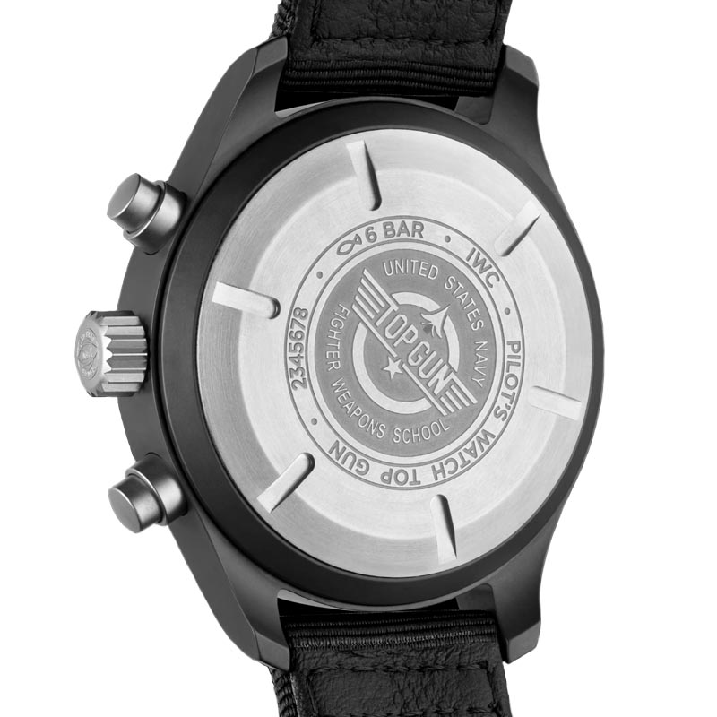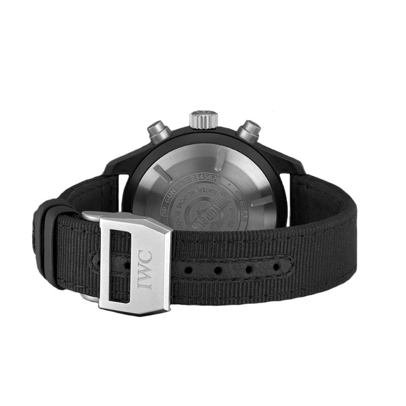 The IWC Pilot Chronograph Top Gun IW389101 watch has been developed with robust and corrosion-resistant materials such as ceramic and titanium for the elite pilots of the US Navy. which are subjected to a high level of g-force. In addition, during extended missions on aircraft carriers, they are exposed to the effects of humid, salty sea air. The ceramic case with non-reflective black zirconium oxide and titanium case back is totally immune to these corrosive effects.