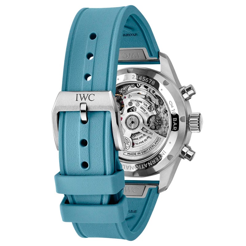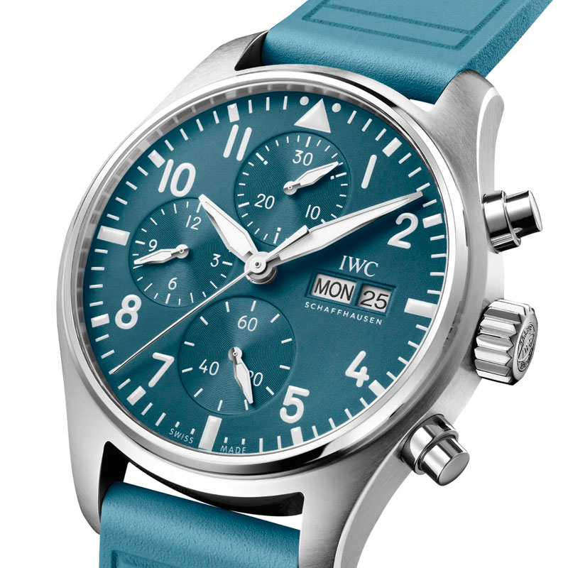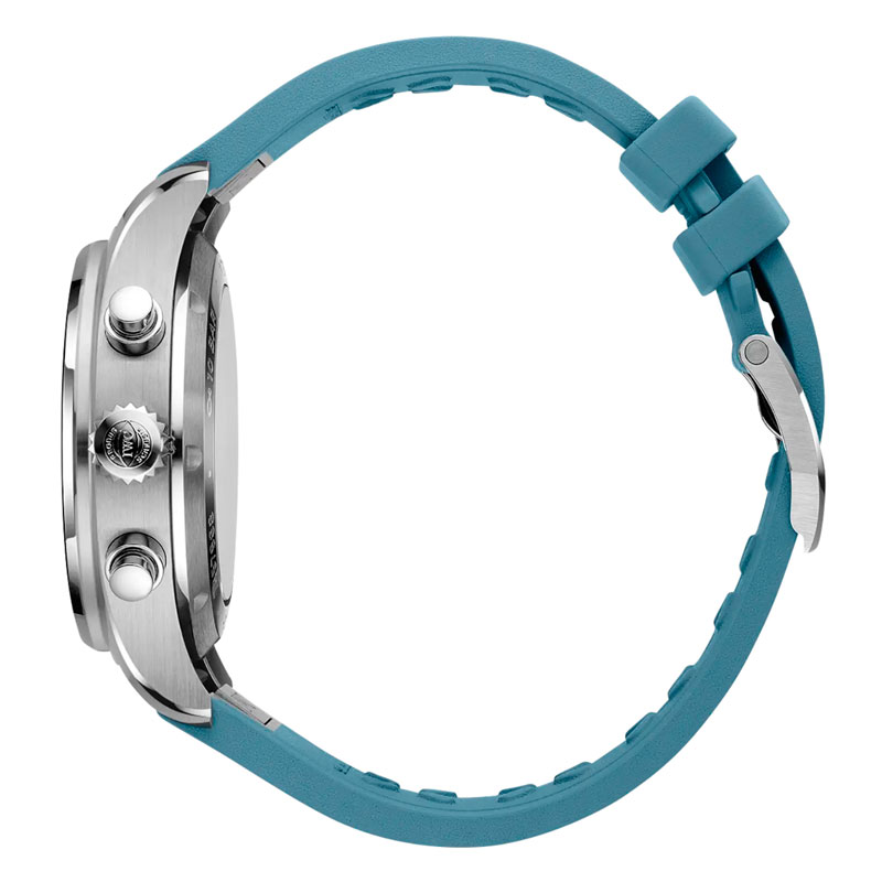 The IWC Pilot Chronograph 41 Top Gun IW388117 watch features an elegant design, featuring a blue dial. The Pilot Chronograph 41 combines a stainless steel case with a dial and rubber strap in the IWC TOP GUN Miramar color, a light blue shade developed by IWC Schaffhausen in collaboration with PANTONE®.
