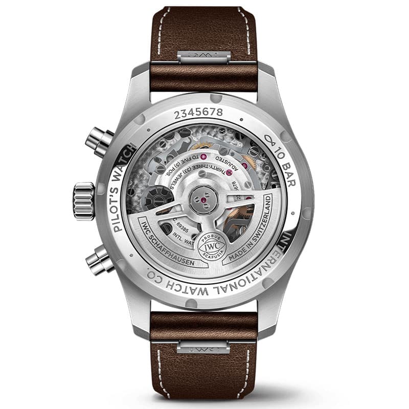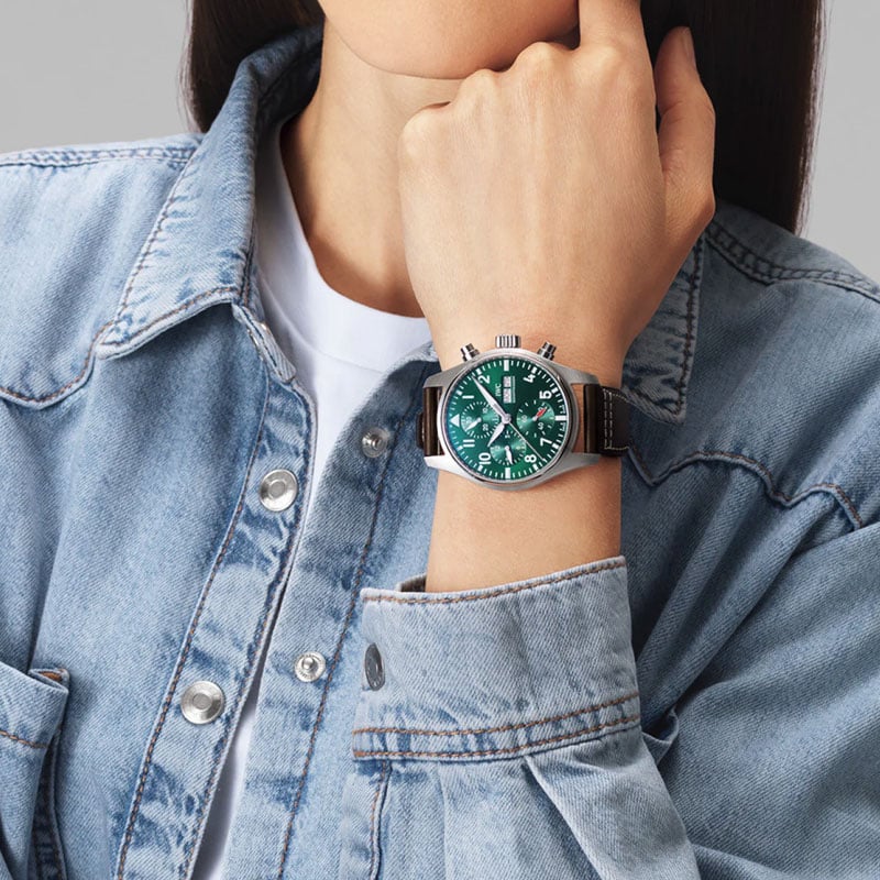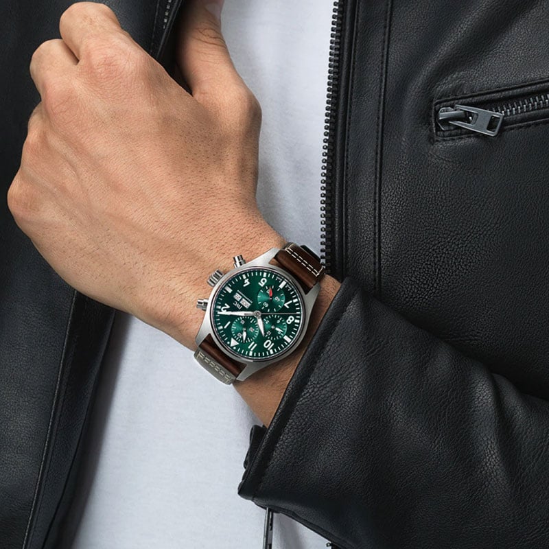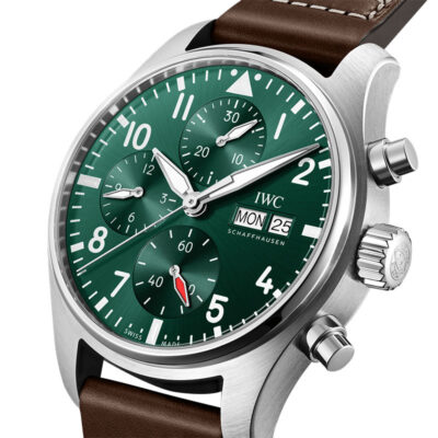 IWC Schaffhausen Pilot’s Watch Chronograph IW388103. Automatic, Self-winding, 41.0 mm diameter, Green dial with luminescence, Brown calfskin strap with EasX-CHANGE system, 20.0 mm strap width. Made in Switzerland