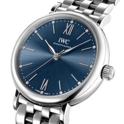 The IWC Portofino Automatic 34 IW357413 watch combines the carefree Mediterranean lifestyle with a touch of glamour and timeless elegance. With its small 34-millimeter stainless steel case, it is feminine and elegant. The reference IW357413 perfectly fits the slimmest wrists and offers maximum wearing comfort. The blue dial with 12 diamonds that make indexes, Roman numerals and silver hands, makes a beautiful contrast with stainless steel bracelet.