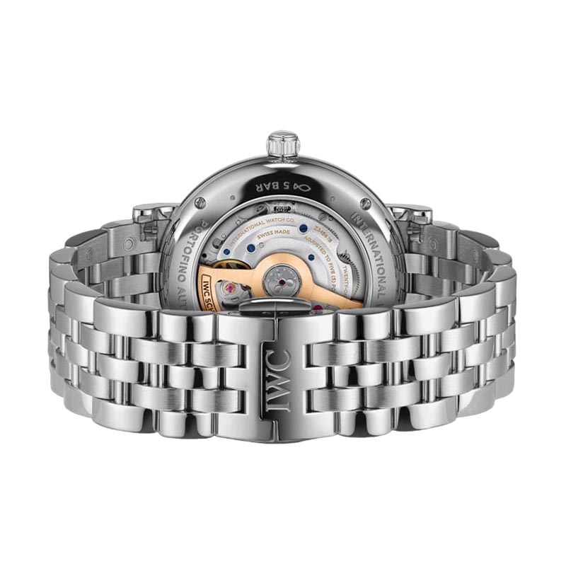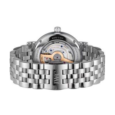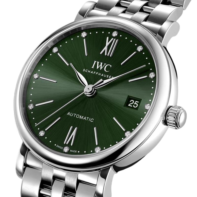 The IWC Portofino Automatic 37 IW458602 watch features an elegant design, showcasing a green dial. It incorporates a stainless steel bracelet that ensures comfort and durability. It has a stainless steel case with a diameter of 37mm. It has an automatic winding IWC-manufactured movement with 32111 Calibre, which provides a power reserve of 120 hours. Its combination of elegance and functionality make this Portofino an outstanding icon of IWC Schaffhausen.