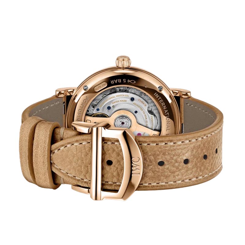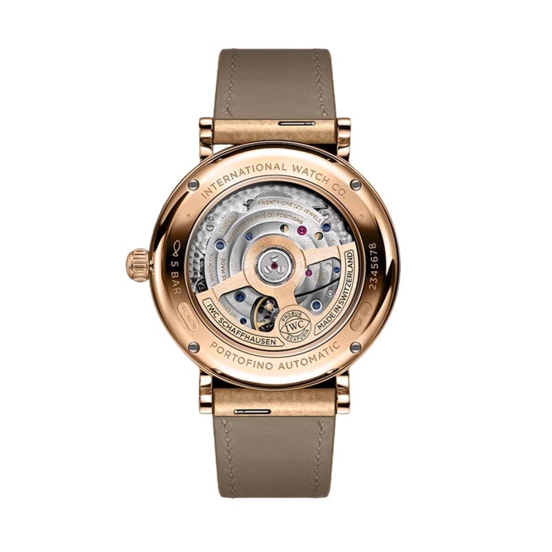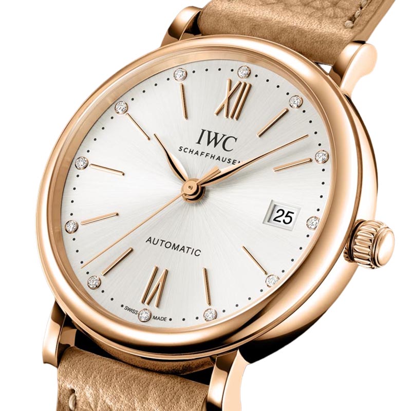 The IWC Portofino Automatic 37 IW458606 watch features an elegant design, showcasing a silver plated dial. It incorporates a beige calfskin strap that ensures comfort and durability. It has a 18 ct 5N gold case with a diameter of 37mm. It has an automatic winding IWC-manufactured movement with 32111 Calibre, which provides a power reserve of 120 hours. Its combination of elegance and functionality make this Portofino an outstanding icon of IWC Schaffhausen.