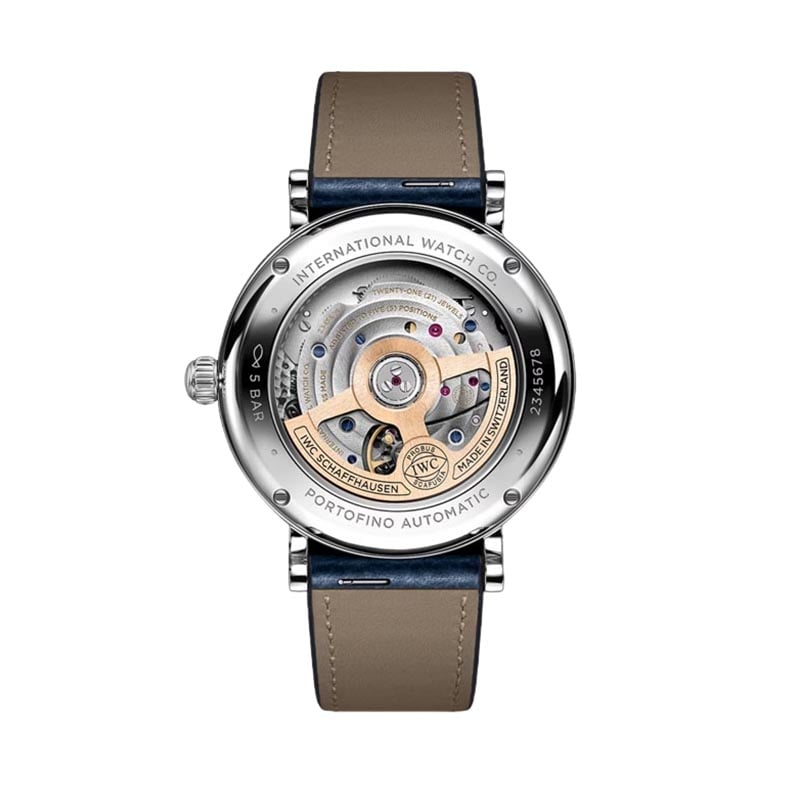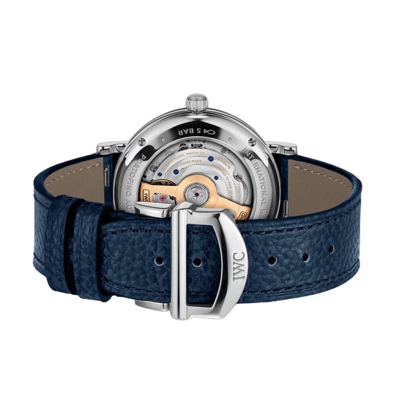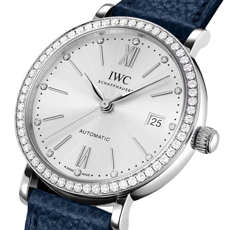 The IWC Portofino Automatic 37 IW658601 watch features an elegant design, showcasing a silver plated dial. It incorporates a blue calfskin strap that ensures comfort and durability. It has a stainless steel case with a diameter of 37mm. It has an automatic winding IWC-manufactured movement with 32111 Calibre, which provides a power reserve of 120 hours. Its combination of elegance and functionality make this Portofino an outstanding icon of IWC Schaffhausen