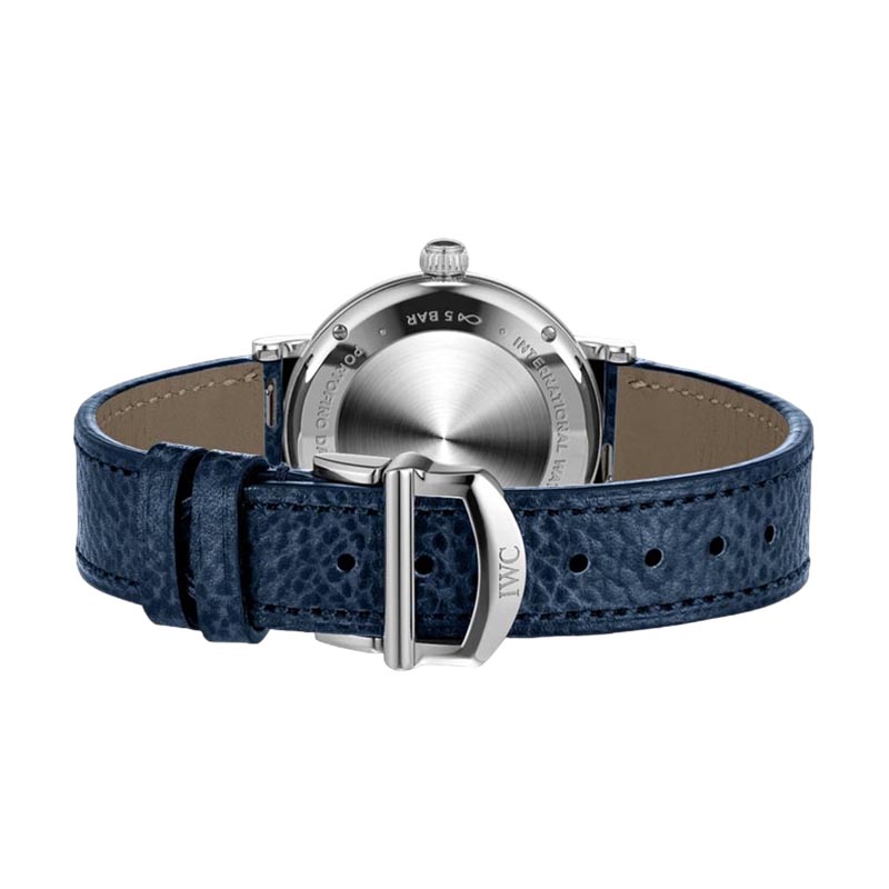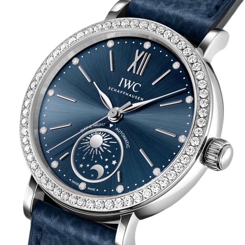 The IWC Portofino Automatic Day & Night 34 IW659801 watch features an elegant design, showcasing a blue dial. It incorporates a blue calfskin strap that ensures comfort and durability. It has a stainless steel case with a diameter of 34mm. It has an automatic winding movement with 35180 Calibre, which provides a power reserve of 50 hours. Its combination of elegance and functionality make this Portofino an outstanding icon of IWC Schaffhausen.
