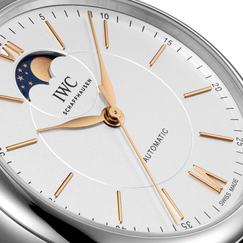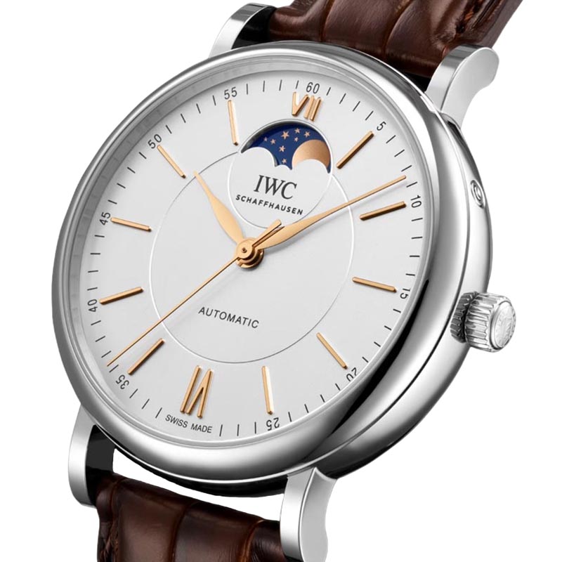 The IWC Portofino Automatic Moon Phase IW459401 watch features an elegant design, showcasing a silver dial. It incorporates a dark brown alligator leather strap that ensures comfort and durability. It has a stainless steel case with a diameter of 40mm. It has an automatic winding movement with 35800 Calibre, which provides a power reserve of 50 hours. Its combination of elegance and functionality make this Portofino an outstanding icon of IWC Schaffhausen.