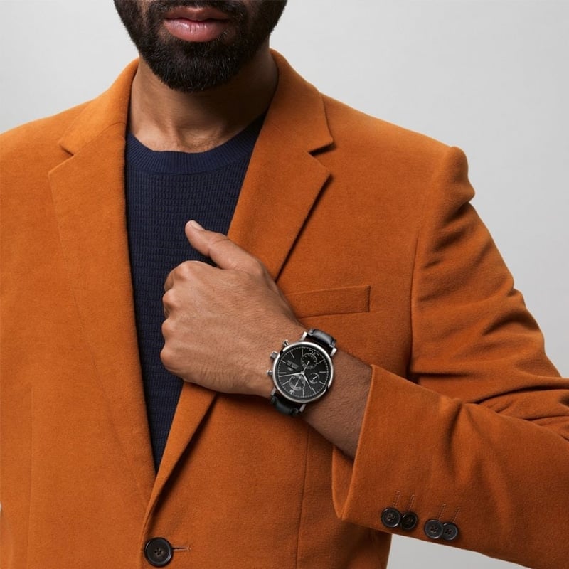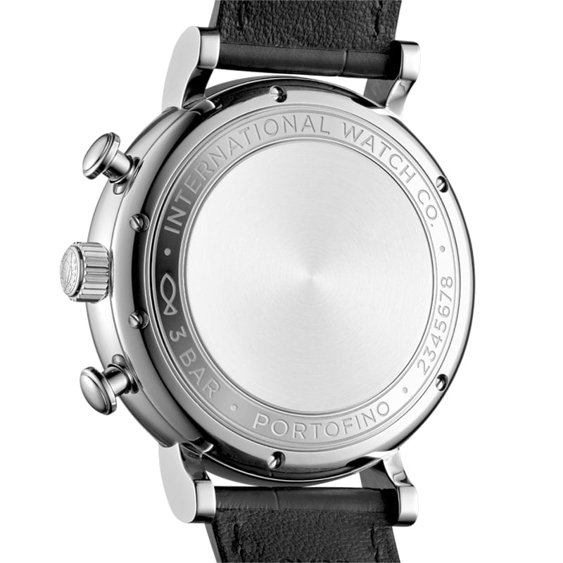 IWC Schaffhausen Portofino Chronograph IW391029 watch. The design of the Portofino Chronograph, with pushers and chronograph indications in an elegant sporty style, is inspired by the 1960s. This stainless steel chronograph with black dial features a domed sapphire crystal and rhodium-plated appliques. Self-winding movement, Caliber 75320 with a power reserve of 44 hours.