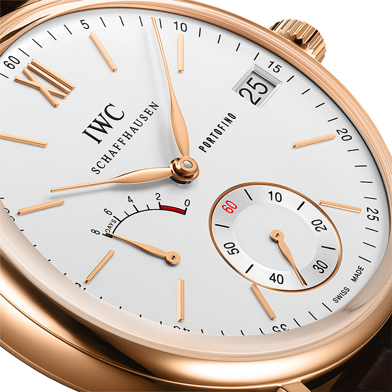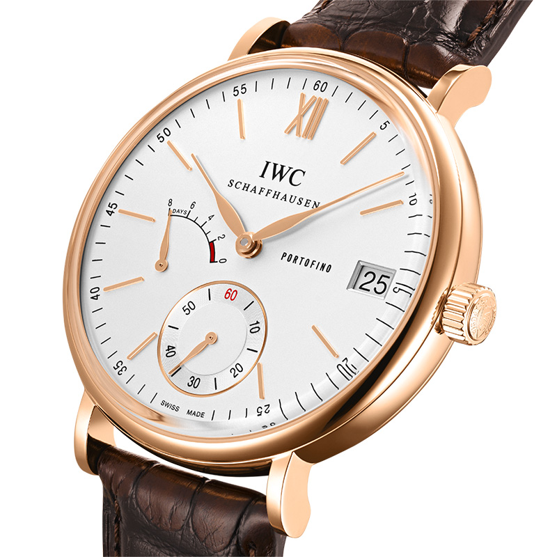 The IWC Portofino Hand-Wound Eight Days IW510107 watch stands out for its elegant design, which showcases a silver dial. It has an 18K red gold case with a diameter of 45mm. It features a dark brown alligator leather strap that ensures a perfect fit on the wrist and offers excellent wearing comfort. It incorporates a hand-wound IWC-manufactured movement with caliber 59210, which provides a power reserve of 192 hours. The combination of elegance and timeless character make this Portofino an outstanding timepiece from IWC Schaffhausen.