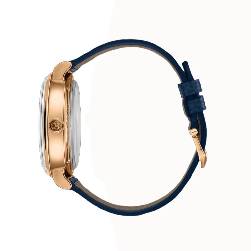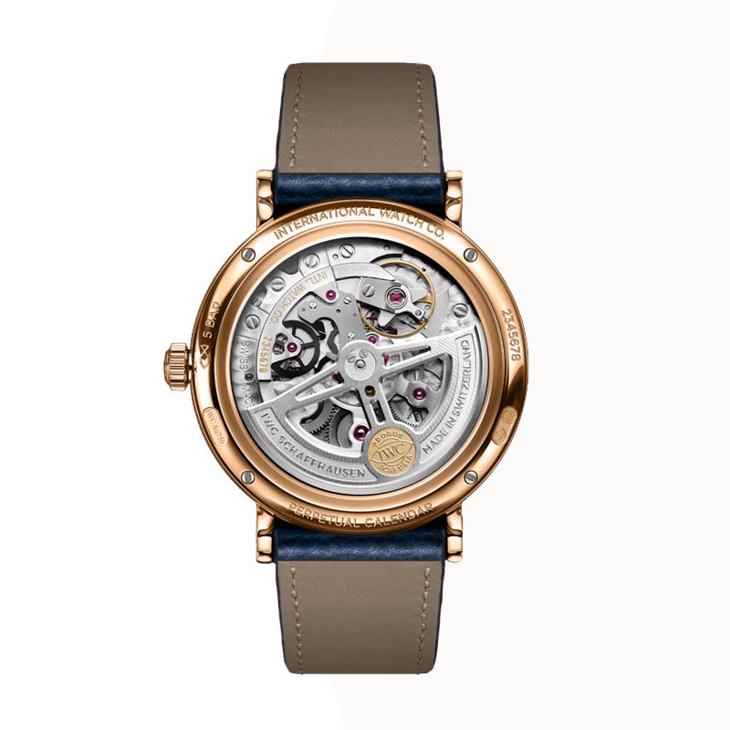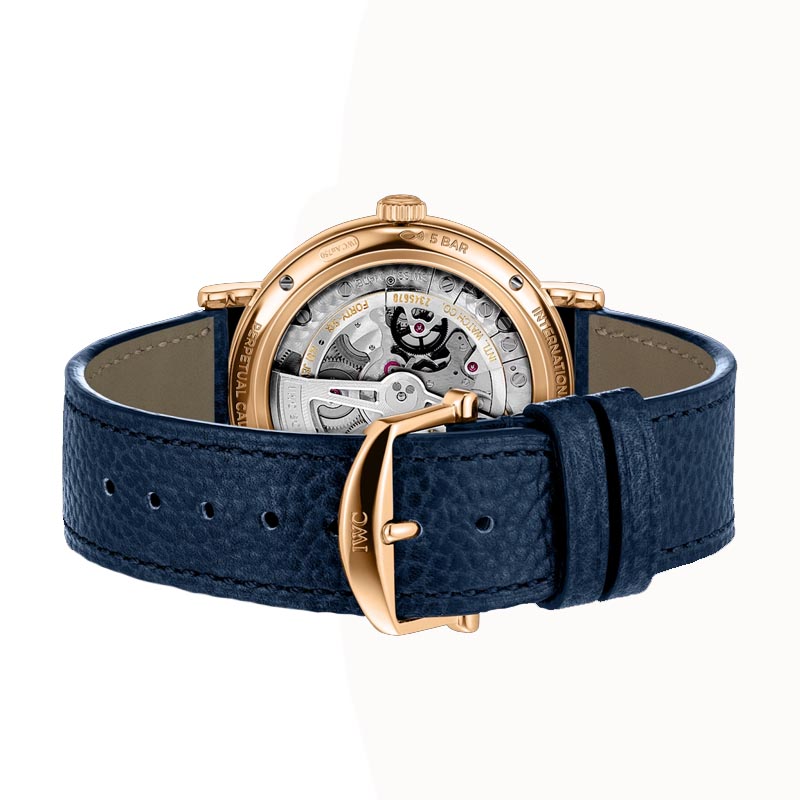 The IWC Portofino Perpetual Calendar IW344602 watch features an elegant design, showcasing a silver plated dial. It incorporates a blue calfskin strap that ensures comfort and durability. It has a 18 ct 5N gold case with a diameter of 40mm. It has an automatic winding IWC-manufactured movement with 82650 Calibre, which provides a power reserve of 60 hours. Its combination of elegance and functionality make this Portofino an outstanding icon of IWC Schaffhausen.