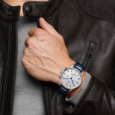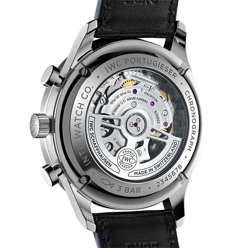 IWC Schaffhausen Portugieser Chronograph IW371605 watch. Automatic, Self-winding, 41 mm diameter, Blue alligator leather strap, 20.0 mm strap width. Made in Switzerland