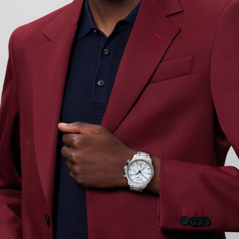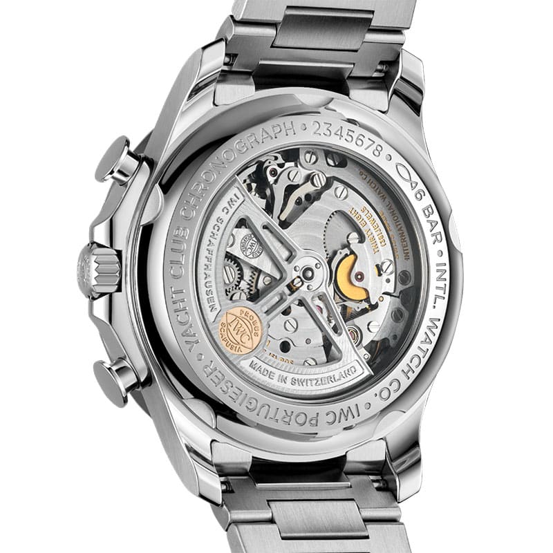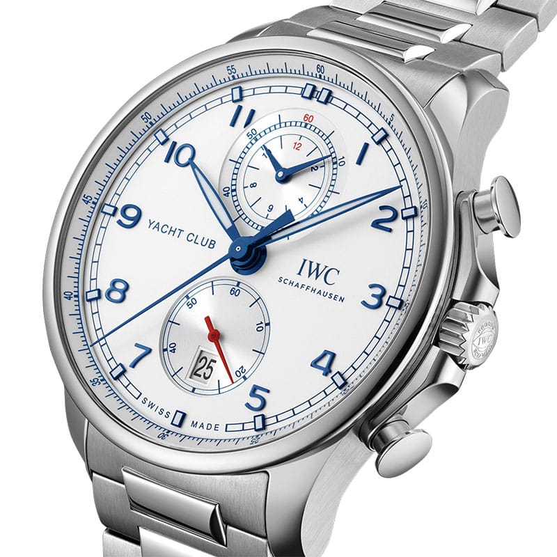 IWC Schaffhausen Portugieser Yacht Club Chronograph IW390702 watch. Automatic, Automatic winding, 44.6 mm diameter, Silver dial with luminescence, Stainless steel bracelet, 22.0 mm strap width. Made in Schaffhausen, Switzerland.