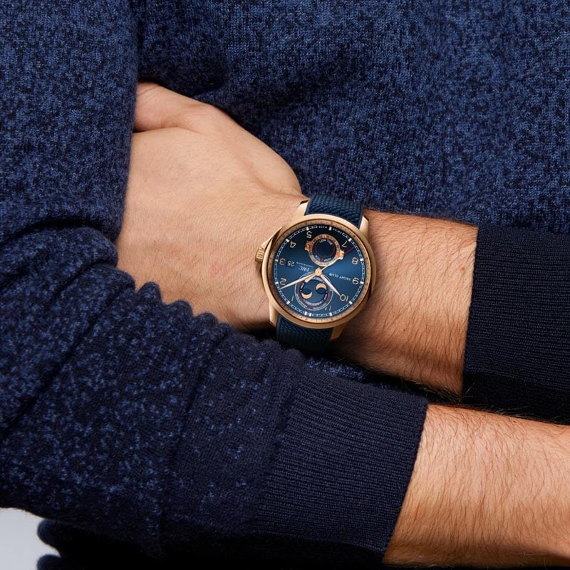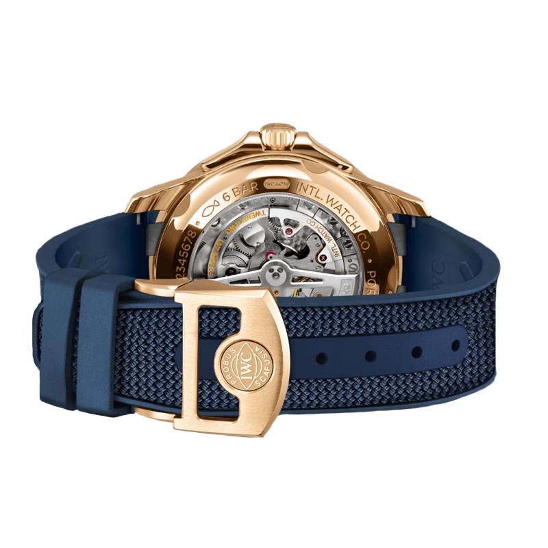 The IWC Portugieser Yacht Club Moon & Tide IW344001 watch features an elegant design, showcasing a blue dial. It incorporates a blue rubber and textile strap that ensures comfort and durability. It has a 18 ct 5N gold case case with a diameter of 44,6mm. It has an automatic winding IWC-manufactured movement with 82835 Calibre, which provides a power reserve of 60 hours. Its combination of elegance and functionality make this Portugieser an outstanding icon of IWC Schaffhausen.