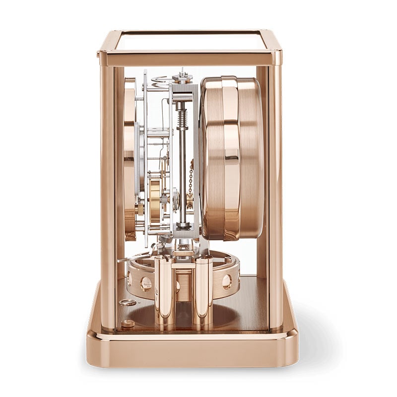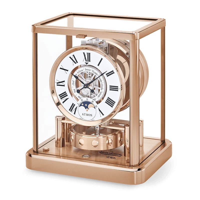 Jaeger-LeCoultre Atmos Classique Moonphase Q5117201 watch. The hours, months and phases of the moon slowly advance on the timelessly elegant dial. The Atmos Classique Phases de Lune pendulum has a golden cabinet with rose gold that makes it a charming object for the place where you decide to install it.