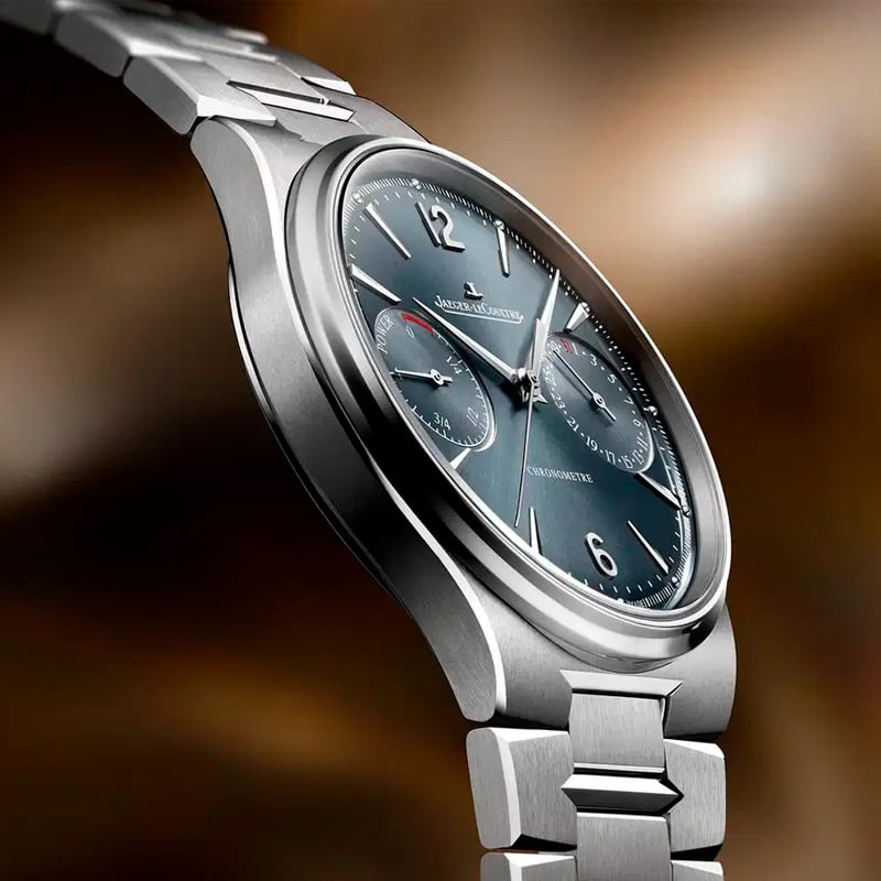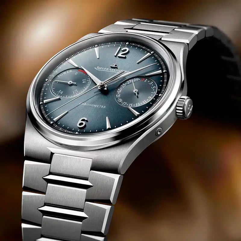 Jaeger-LeCoultre Master Control Chronometre Date Power Reserve Q4168120. This stainless steel timepiece features a refined 39 mm case, just 9.2 mm thick, paired with a seamlessly integrated metal bracelet boasting sophisticated brushed and polished finishes. Its captivating blue-gray sunray dial is distinguished by symmetrical light blue subdials that elegantly display the date and power reserve. Inside beats the in-house caliber 738, offering a robust 70-hour power reserve and ensuring precision certified by Jaeger-LeCoultre’s HPG seal, which meets COSC standards by subjecting the complete watch, case and all, to rigorous testing under real-world conditions.