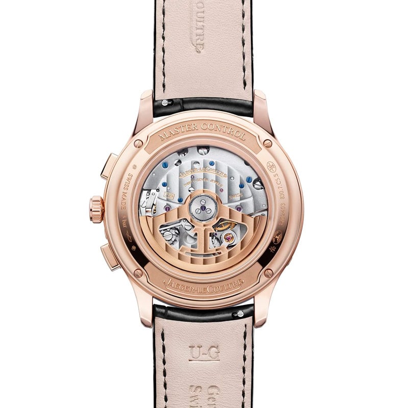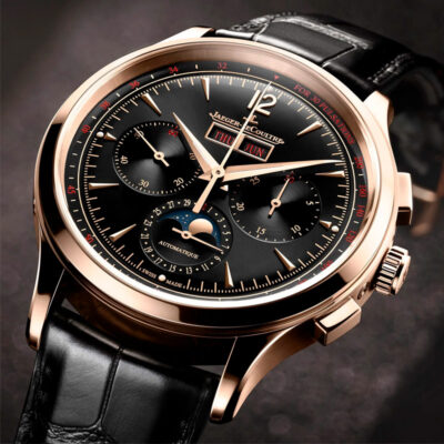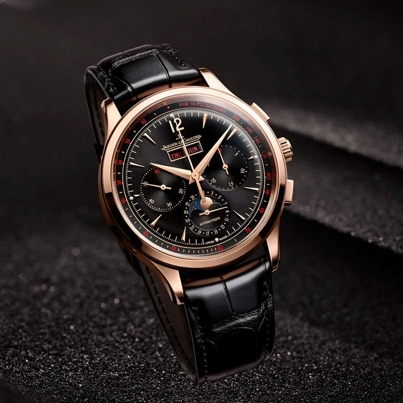 Jaeger-LeCoultre Master Control Chronograph Calendar Q413257J watch. Black, gold and red. Three colors adorn the Master Control Chronograph Calendar watch with its modern black dial with sunray finish. 40mm rose gold case. Black dial with sunray finish. Automatic movement. Caliber 759. Functions: Hours, minutes, seconds indicator, 30-minute counter, pulsimeter, chronograph, moon phases, date and day. Black alligator leather strap.