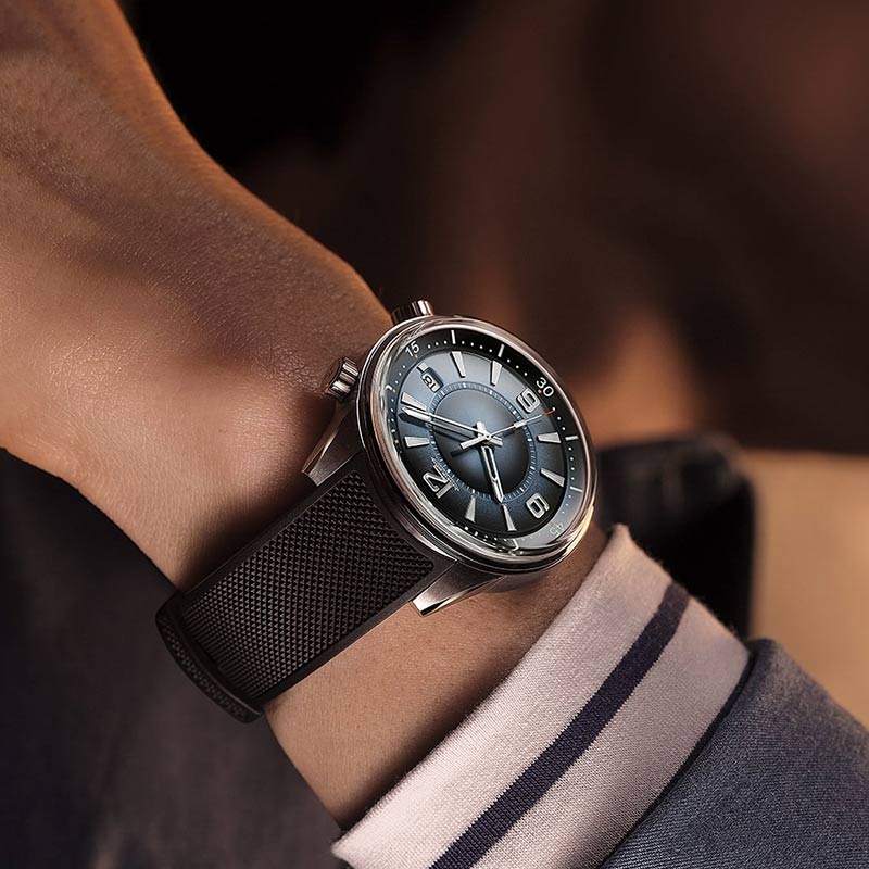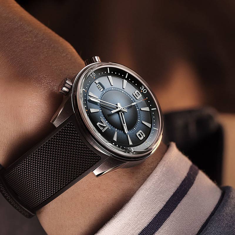 Jaeger-LeCoultre Polaris Date Q9068650 watch. Polaris Date offers a completely natural harmony. 42mm steel case. Bluish grey dial. Automatic movement. Caliber 899. Functions: Hours, minutes, seconds indicator. Black rubber strap.
