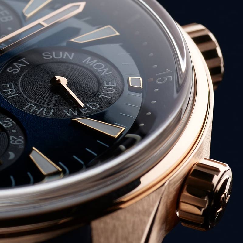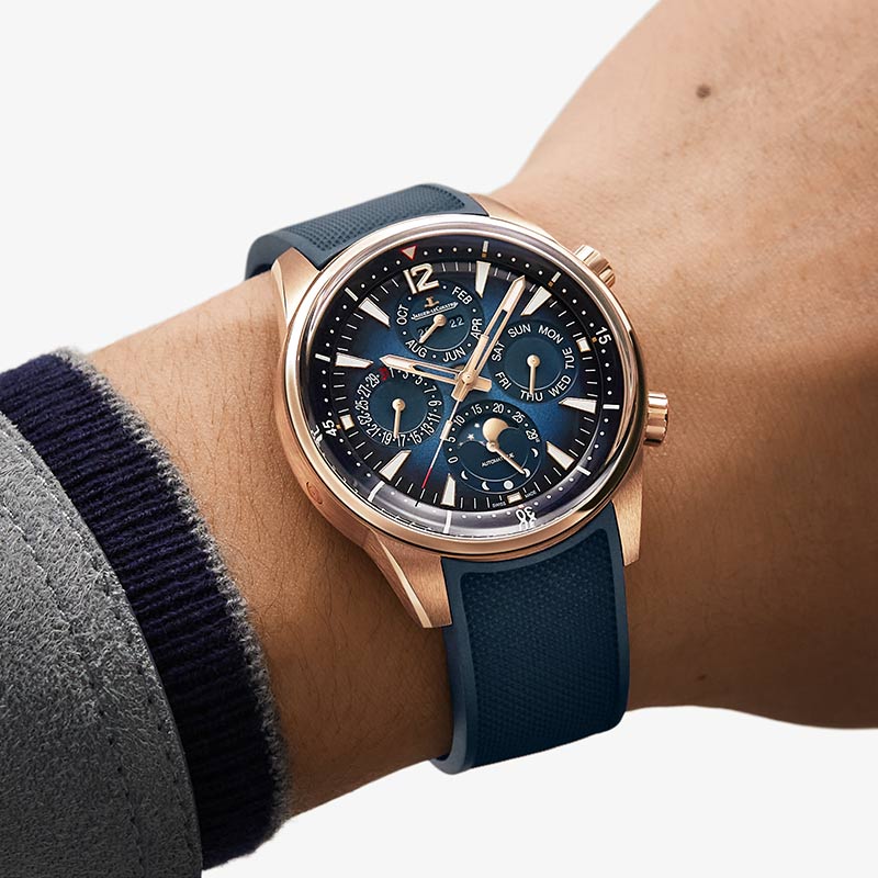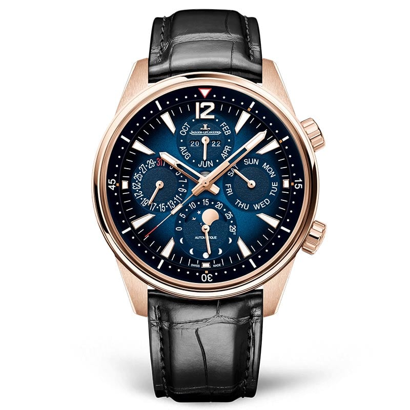 Jaeger-LeCoultre Polaris Perpetual Calendar Q908268J watch. The perpetual calendar is considered one of the most difficult watchmaking complications to master. The new Polaris Perpetual Calendar watch, sporty and elegant, invites today’s adventurer to enjoy near-perpetual precision. This new Jaeger-LeCoultre watch, equipped with the caliber 868 and designed, manufactured and assembled in the Manufacture, displays its 351 components under its sapphire case back. Among the advances integrated in this movement are the moon phases of both hemispheres, with a retrograde hand for the southern hemisphere. The dial, enhanced by the rose gold bezel and case lugs, sports a stunning gradient in shades of blue. The luminescent hands and hour markers stand out against the ocean blue color, along with the perpetual calendar and moonphase indications. The Polaris Perpetual Calendar watch is also available with a duo of interchangeable straps: a blue rubber strap and a black alligator leather strap with a folding buckle.