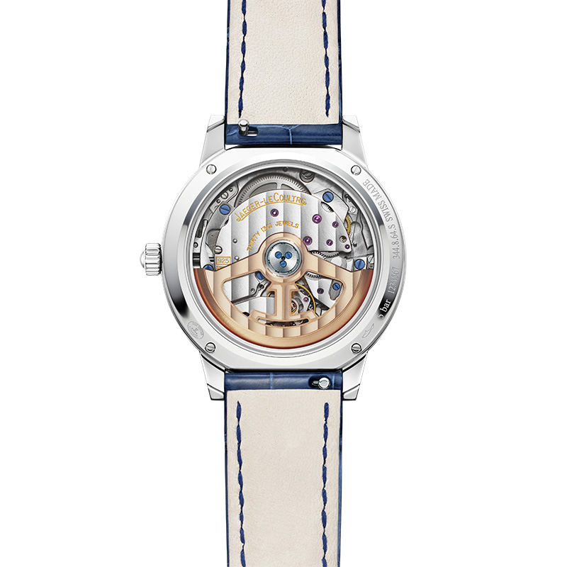 The Jaeger-LeCoultre Rendez-Vous Classic Moon Q357842J watch has an elegant design, which displays a silver dial with guilloché. It features a blue alligator leather strap that ensures sturdiness and comfort. It has a stainless steel case with a diameter of 34mm, set with 107 diamonds for a total of approximately 0.7 cts. It incorporates an automatic movement that provides a power reserve of approximately 38 hours. Of impeccable sophistication, the Rendez-Vous Classic offers an elegant and refined silhouette.