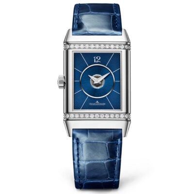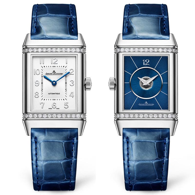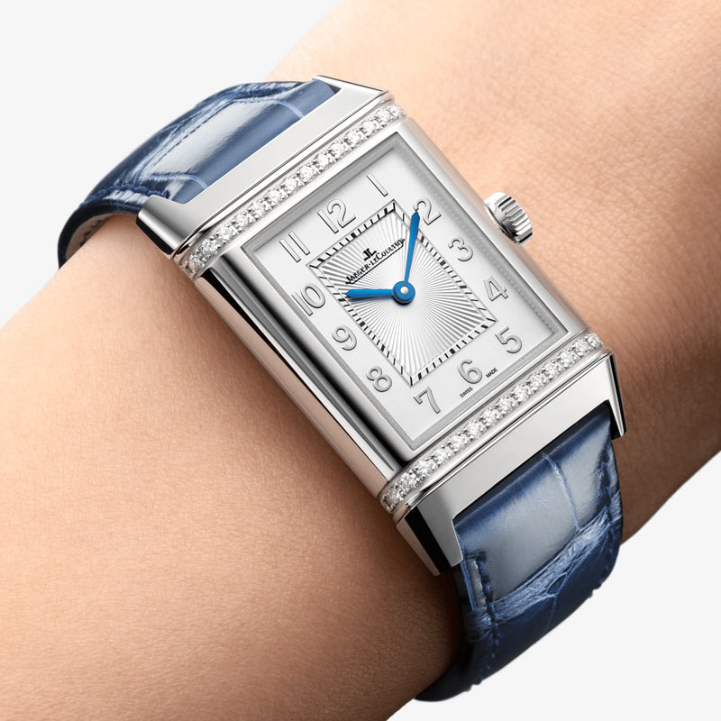 Jaeger-LeCoultre Reverso Classic Duetto Q2578480 watch. Neither completely the same nor completely different. Joining the iconic Reverso Classic collection are two new models equipped with an automatic movement – the Jaeger-LeCoultre caliber 968A – that truly facilitates their everyday use. In its stainless steel version, the Reverso Classic Medium Duetto watch brilliantly revives the art deco style codes that define it: the rectangular case, the reversible design and the emblematic gadroons. It also features two rows of diamonds on the front and back. This new interpretation, firmly feminine, gives the Duetto design the opportunity to offer a double set of hands in two different yet complementary configurations. It is a perfect model for the woman who likes to live her time with intensity, day or night.